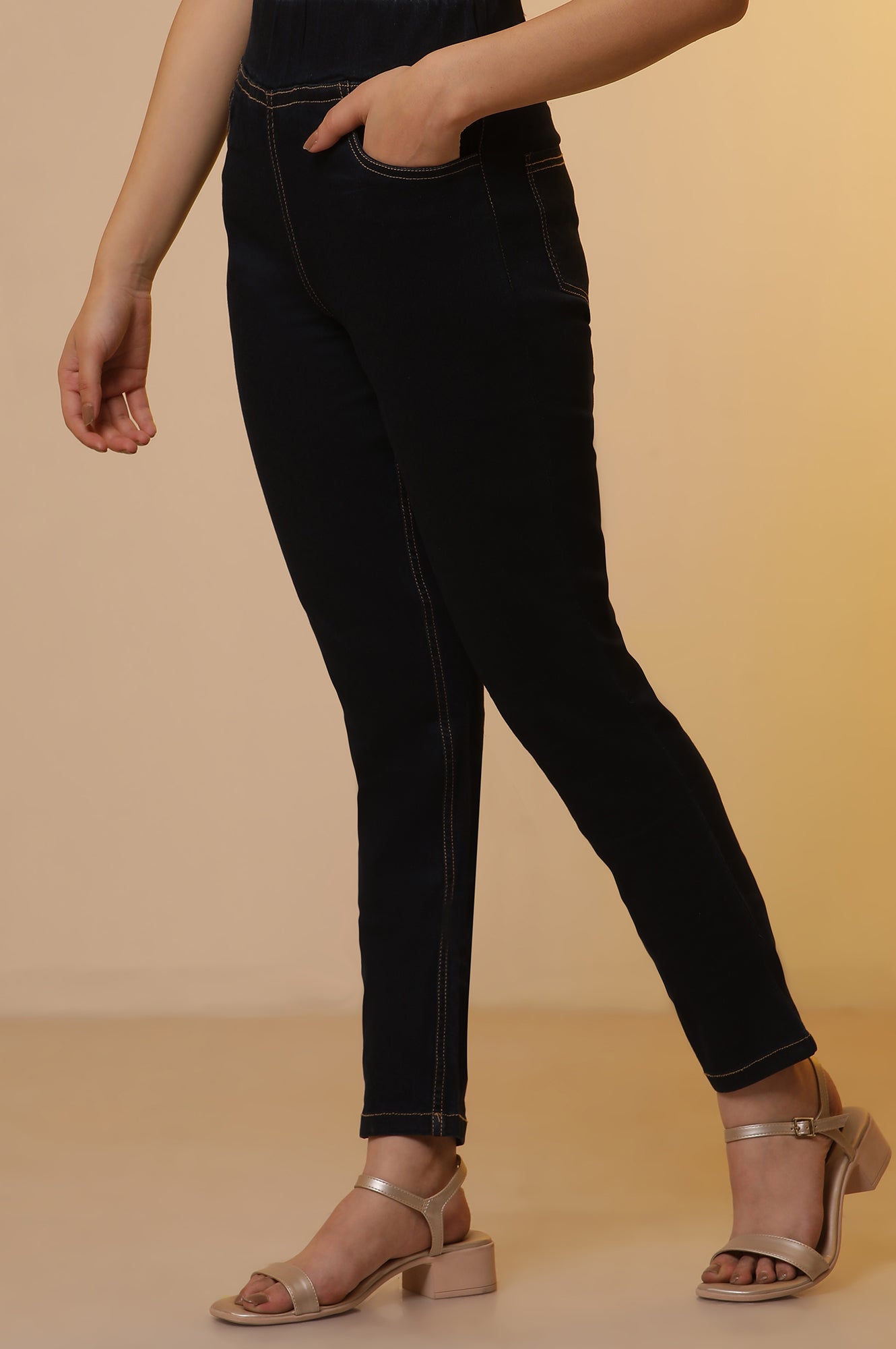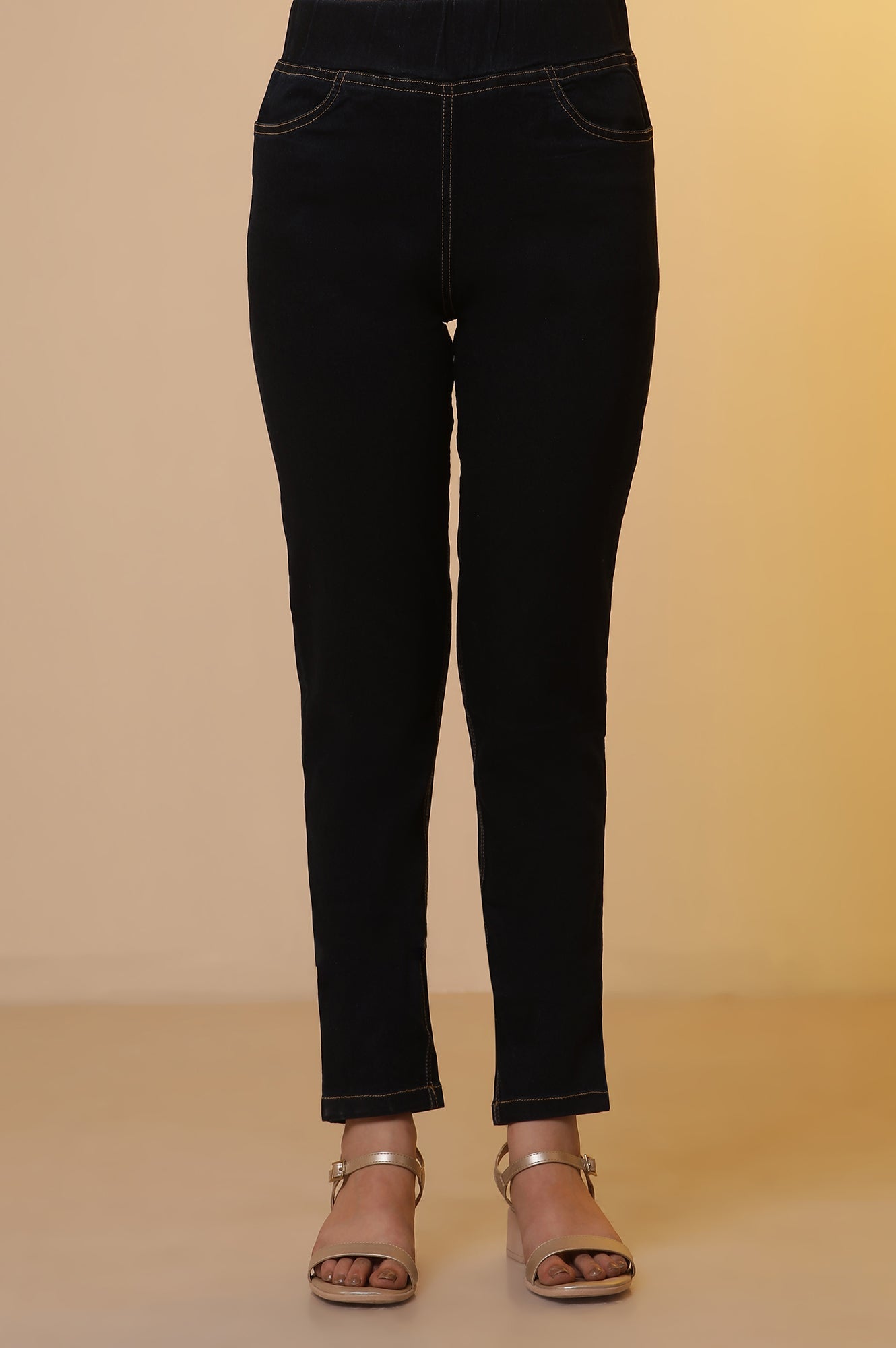 Go out this summer with this soothing blue cotton short kurti and denim set. The kurti has polka dot print and further accentuated with lace. It is paired with blue denim slim fit jeggings.
