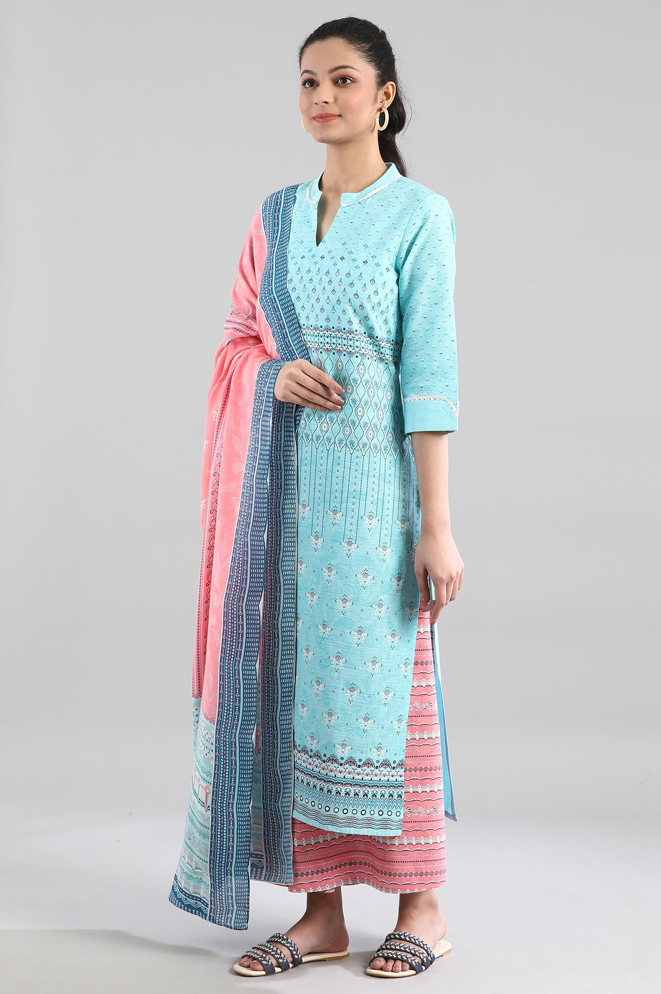Plume blue printed straight kurta in band with V collar and regular three-quarter sleeves.