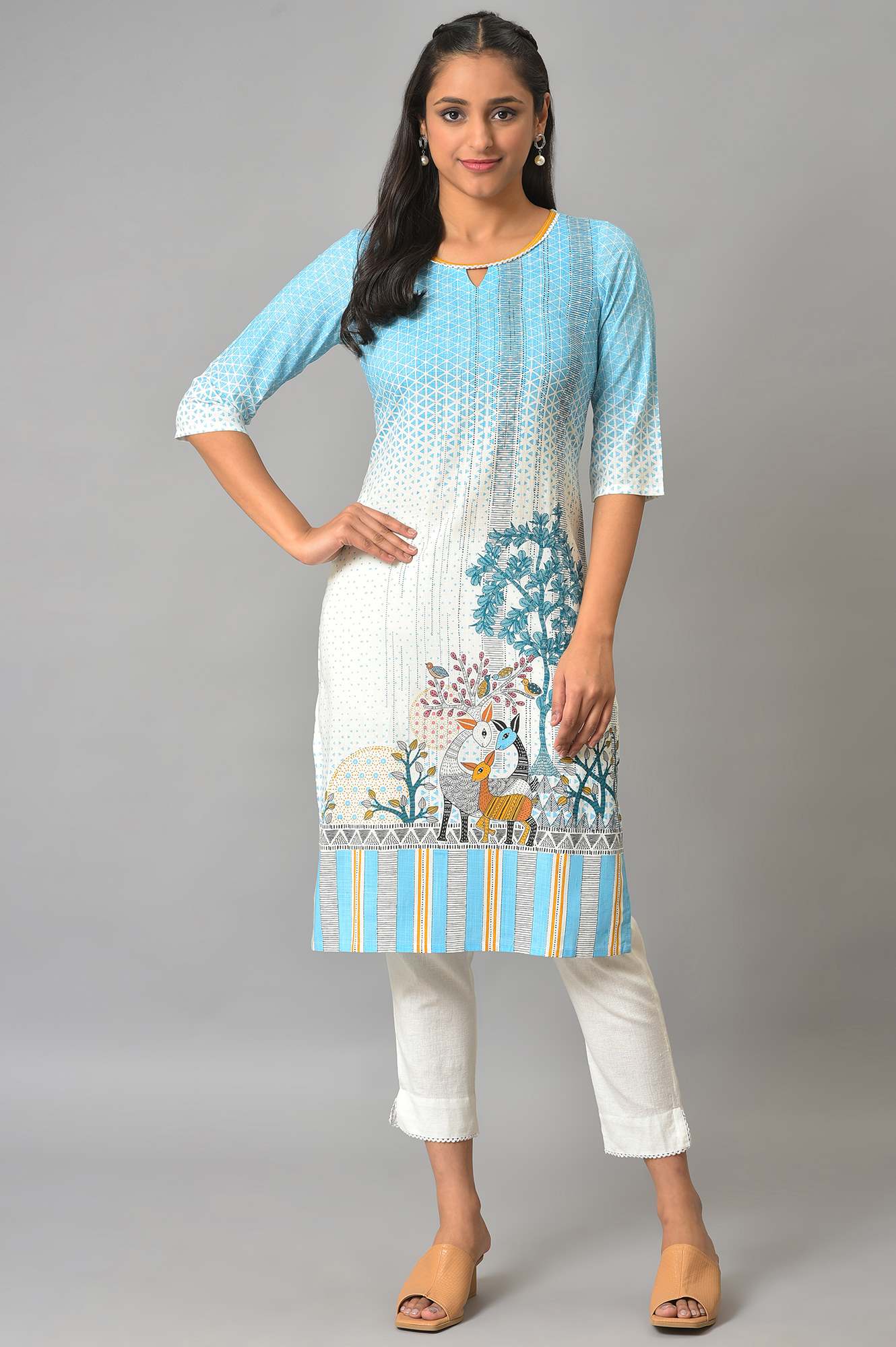Give Your Casual Wear Collection A Stylish Upgrade With This Ice Blue Placement Printed, Straight kurta. It Features The Perfect Blend Of Playfulness And Simplicity. The Contrast Neck Binding With A Top Stitch, Lace Insert And Mini Cutout Uplifts The Look..
