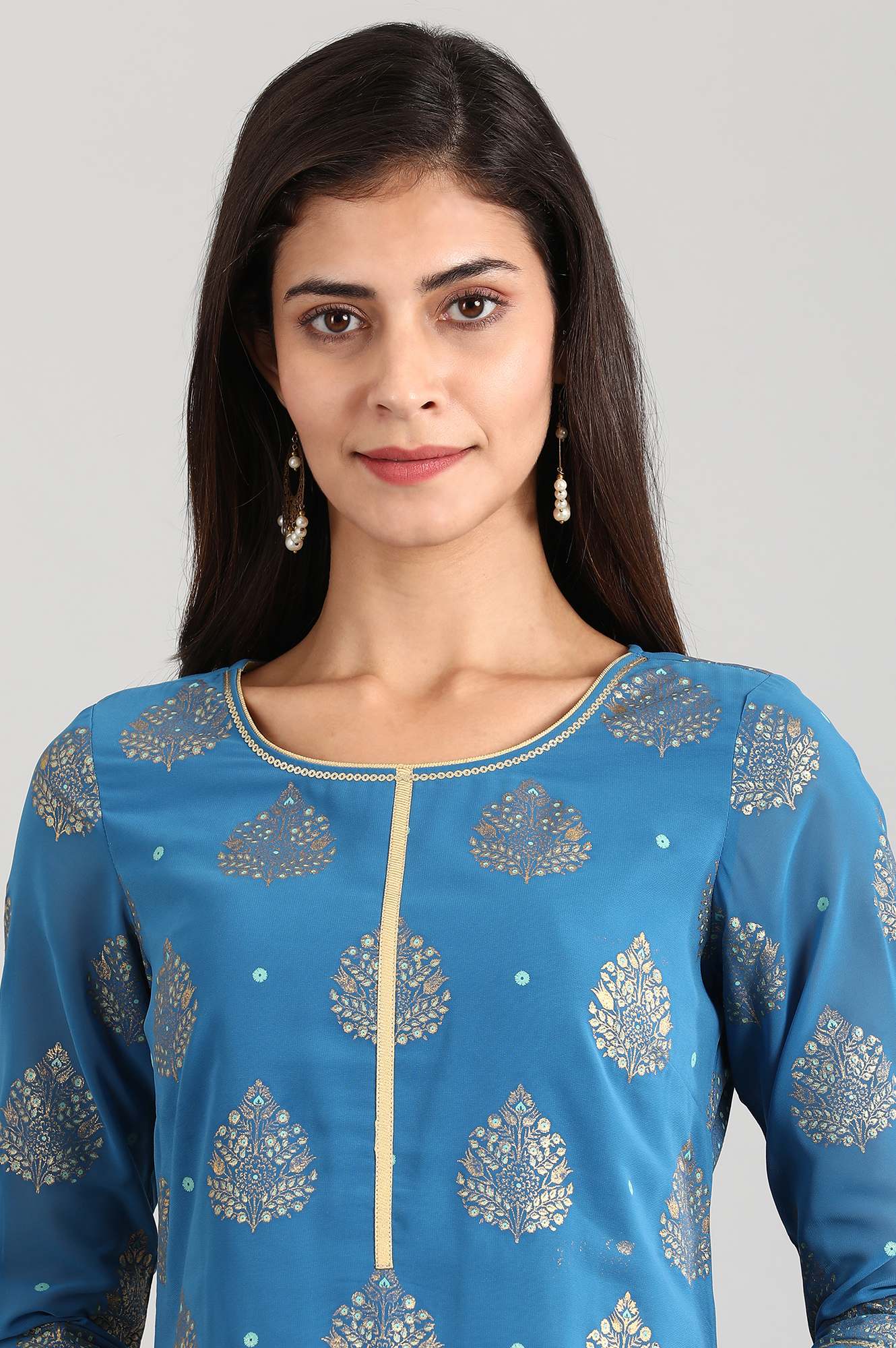 Blue round neck straight Liva kurta with printed detail and tie-up at both sides.