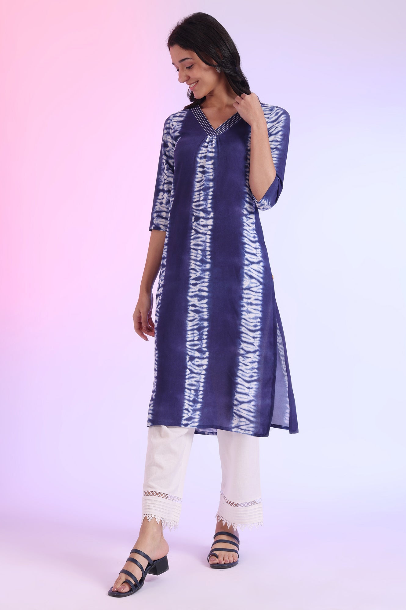 Aurelia presents this elegant blue kurta, perfect for the modern woman who appreciates fusion fashion. The mid-calf length kurta features a flattering v-neck and three-quarter sleeves, making it suitable for various casual occasions. Crafted from 100% viscose using a woven construction technique, this kurta offers both comfort and style. The straight cut silhouette is enhanced by a stylish slit detail, adding a contemporary touch to the traditional design. The digital print on the fabric adds a unique and eye-catching element to the overall look. This versatile piece from Aurelia's kurta collection is an excellent choice for women who want to blend traditional and modern styles in their everyday wardrobe.