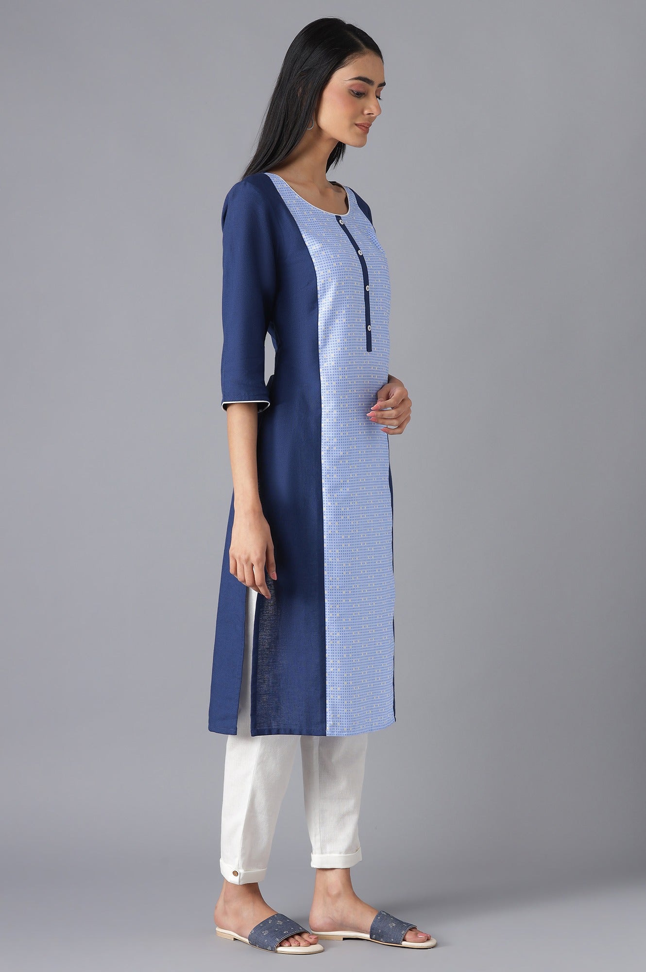 Step out in style for a casual day out or a elevate your office wardrobe with this modern ethnic kurta set. The set includes blue solid straight fit kurta with printed front panel and it is paired with solid trousers.