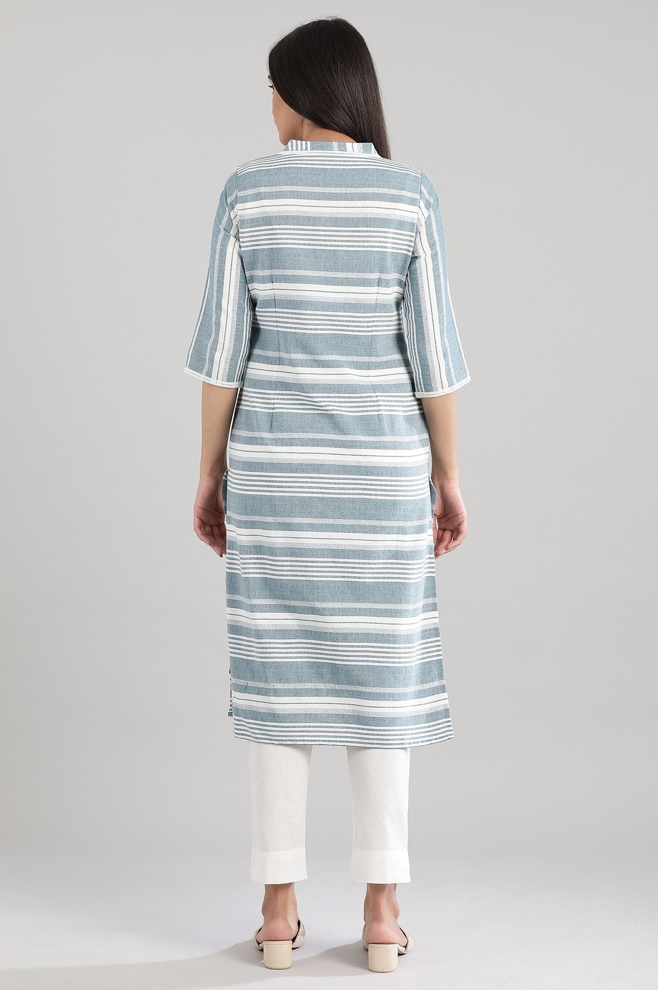 This blue round neck 3/4 sleeve kurta has side slits.