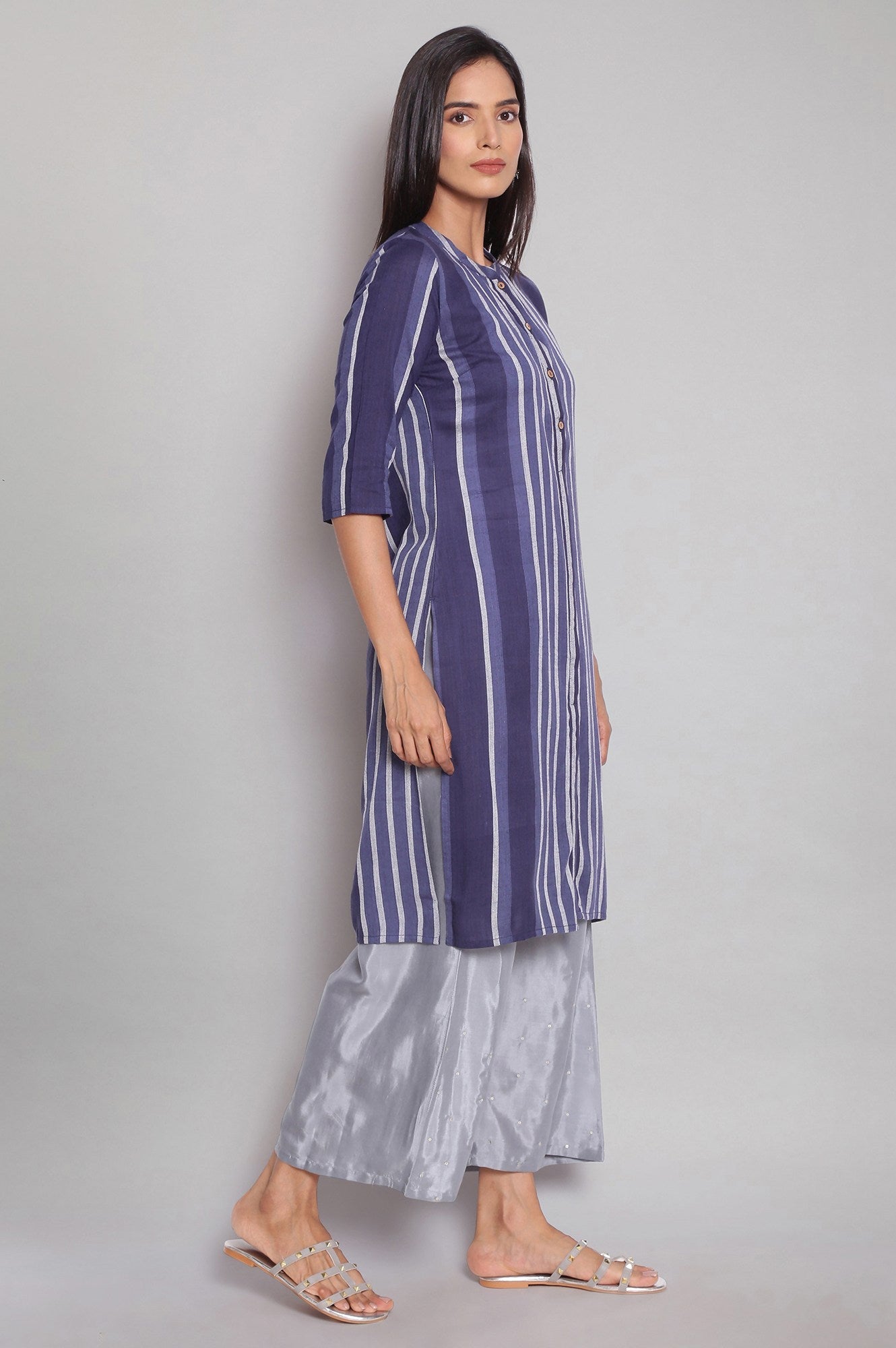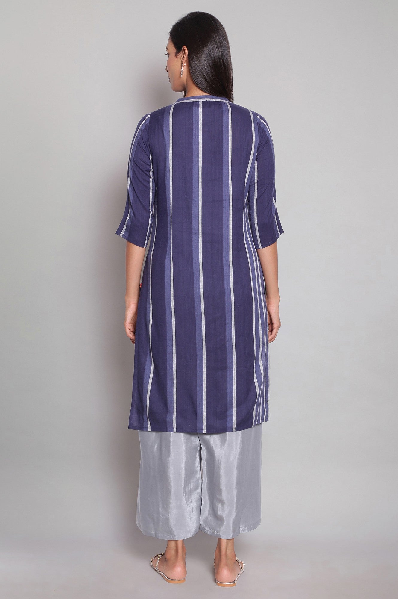 Amp Up Your Casual Wardrobe With This Yarn-Dyed Blue Stripes kurta. Designed In Straight Silhouette The kurta Has Mandarin Collar And Three-Quarter Sleeves.