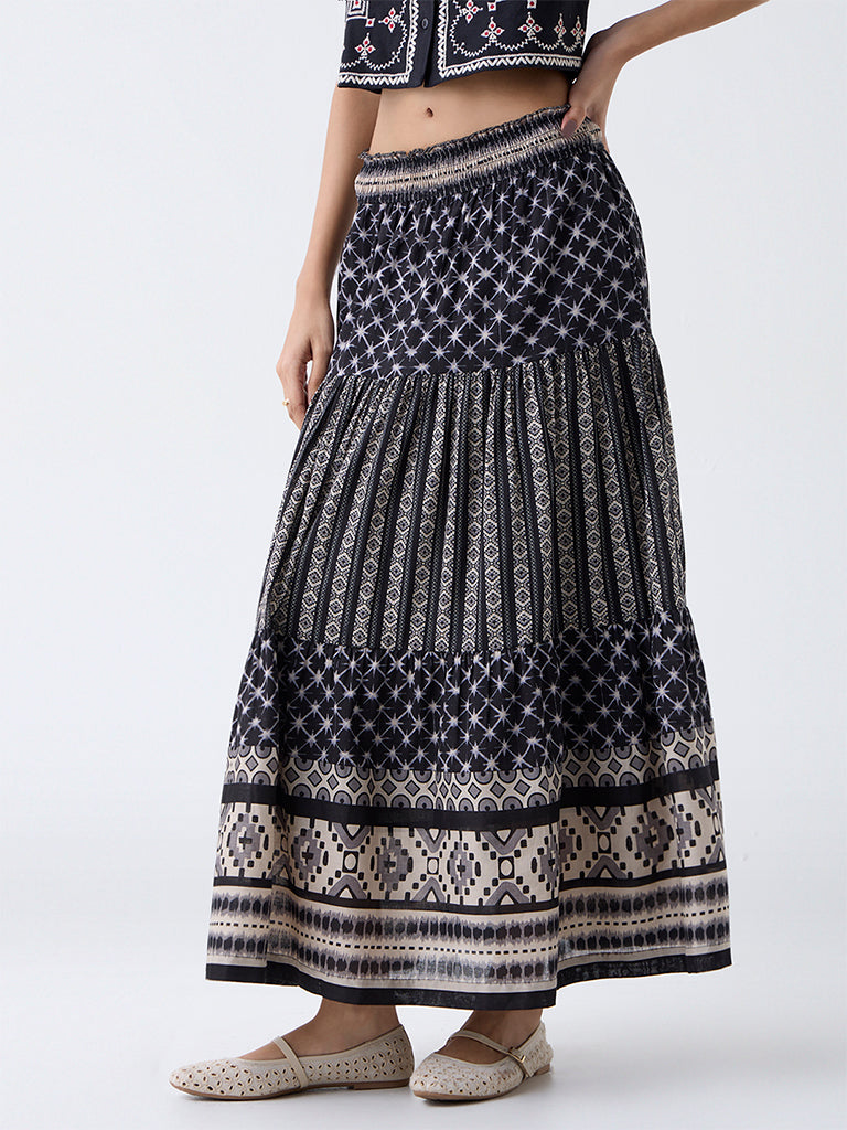 Bombay Paisley Black Printed Tiered Cotton Skirt
