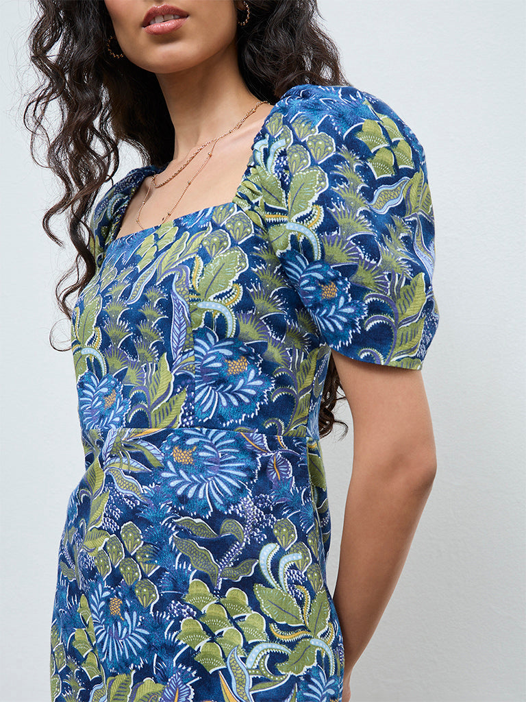 Bombay Paisley Blue Botanical Cotton A-Line Dress