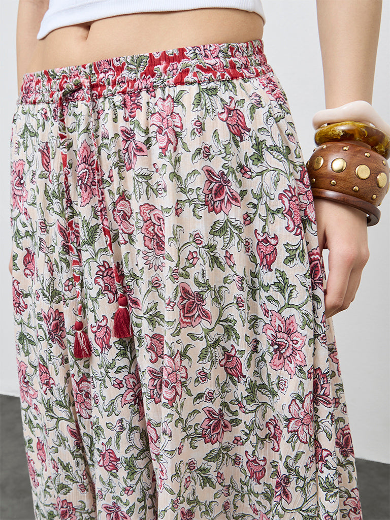 Bombay Paisley presents this off-white and pink floral printed cotton skirt designed with a soft fit and flare silhouette. An elasticated waistband with adjustable drawstrings ensures a flexible fit. Crafted from breathable cotton, the lightweight construction and gentle drape make it a summer ready piece with a fresh, feminine appeal.