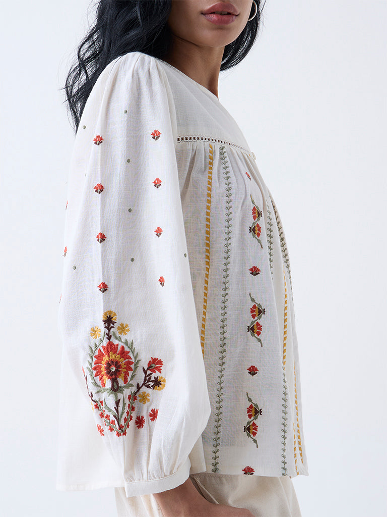 Bombay Paisley Off-White Floral Embroidered Cotton Top