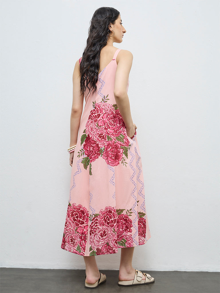 Defined by vivid floral prints, this peach dress from Bombay Paisley is shaped in an A-line silhouette. It is framed with a V-neck and a sleeveless cut, while the cotton-blend fabric offers comfort and fluid movement through the day. Designed for easy wear, it transitions seamlessly from casual mornings to relaxed daytime plans.