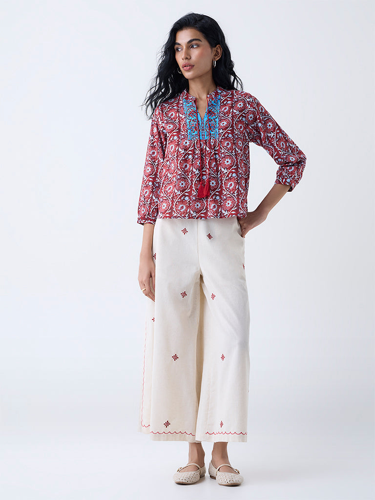 This red top from Bombay Paisley brings an effortless, boho ease to everyday dressing. Its folk-inspired foliage print adds a crafted charm, while the split neckline finished with tasseled tie-up accents introduces a soft point of interest. Blouson sleeves and a relaxed silhouette enhance its fluid shape, and the breathable cotton-rich fabric keeps the piece comfortably wearable through long, unhurried days.