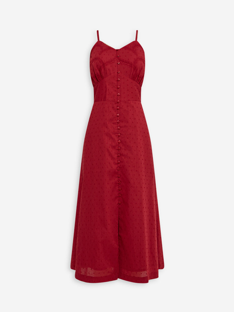 Sculpted in an A-line silhouette, this red dress from Bombay Paisley is fashioned with Swiss-dot embroidery throughout. Its pure cotton build ensures enhanced comfort, while the V-neck and adjustable straps make it a breezy choice for sunlit days and relaxed outings.