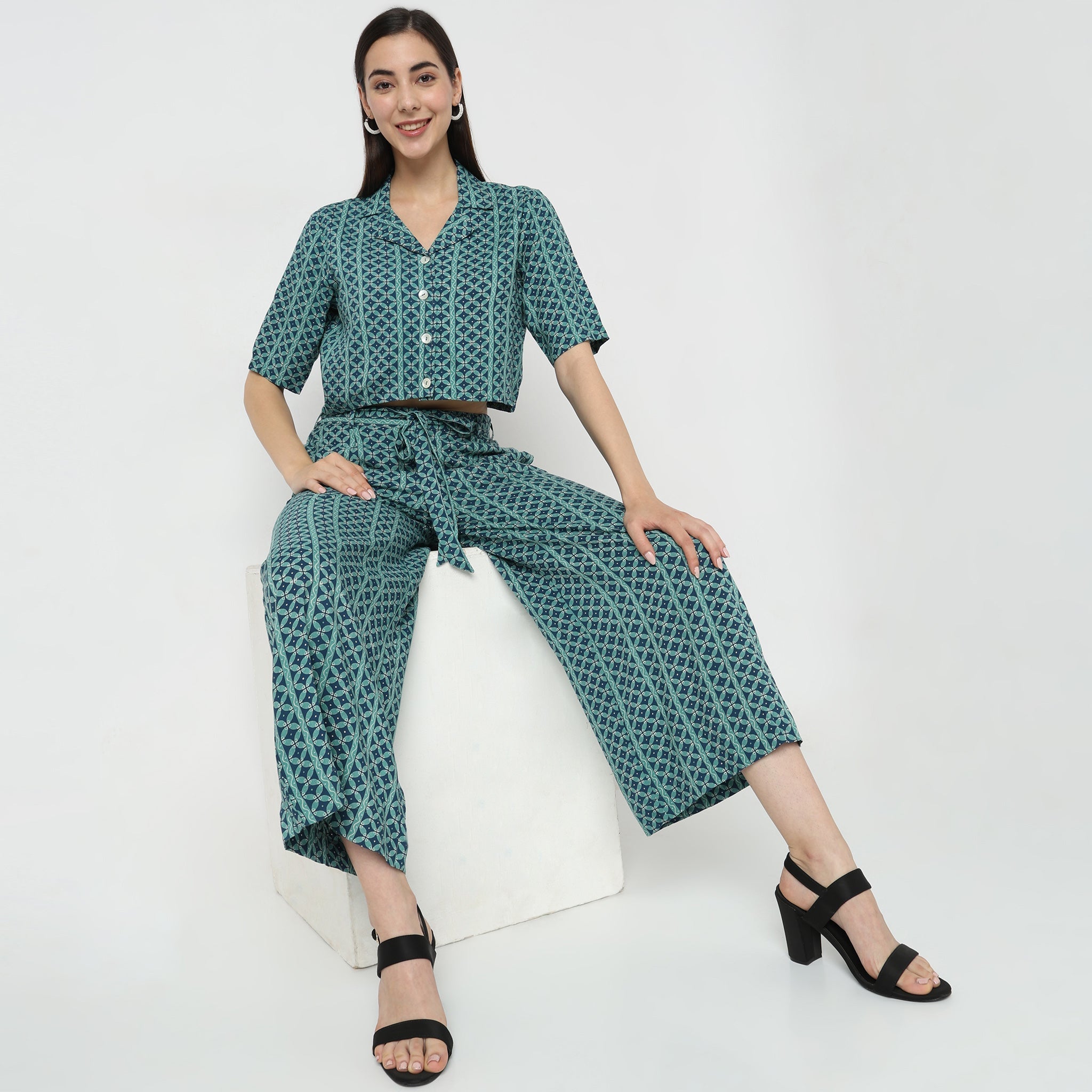 These fusion sets - ctop & bottom theme, boxy fit top has crop top length. Made from viscose, it is soft and comfortable to wear.