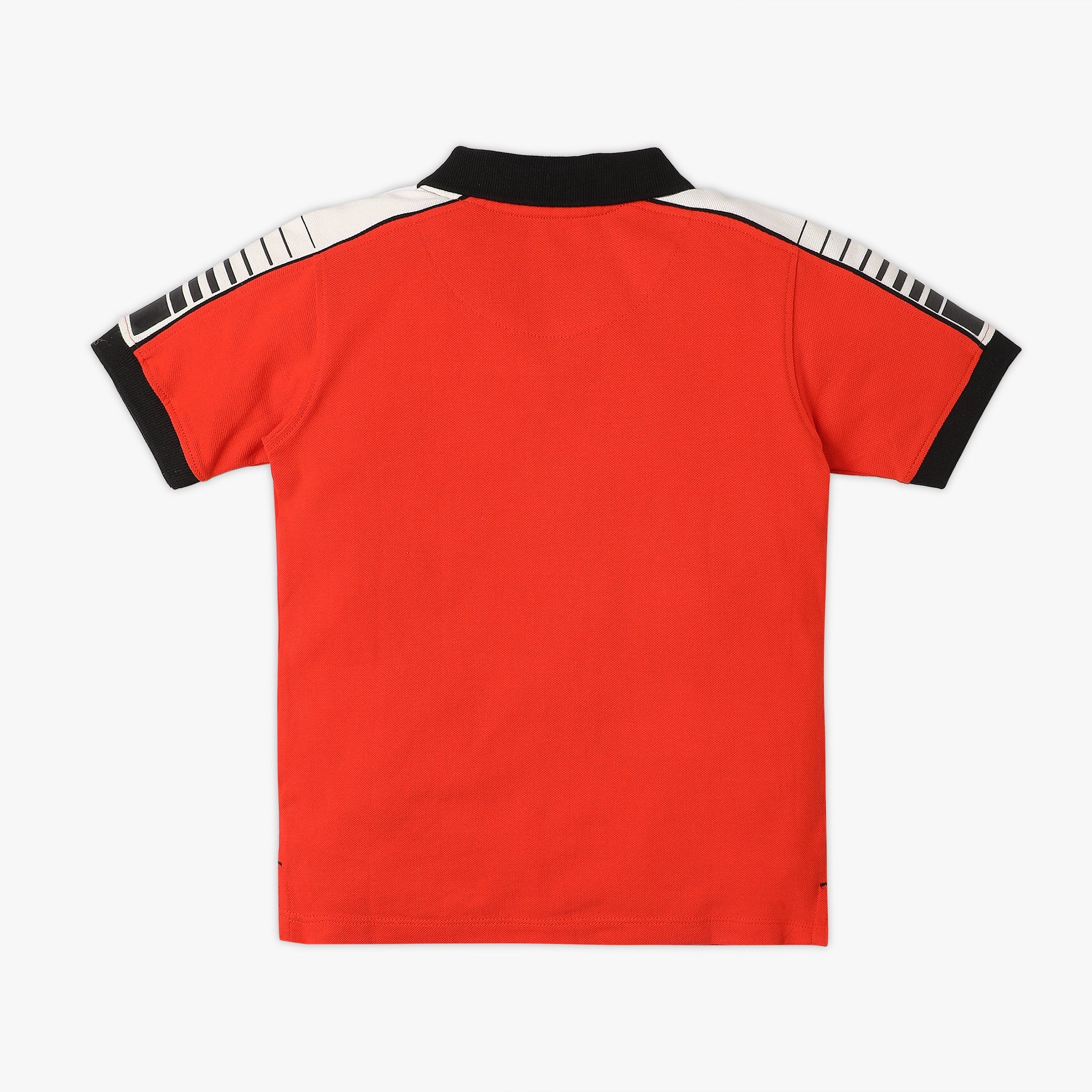 These cut and sew theme, cut and sew pattern t-shirt has polo neck and half sleeve. Made from cotton, your kid's feel comfortable wearing the product.