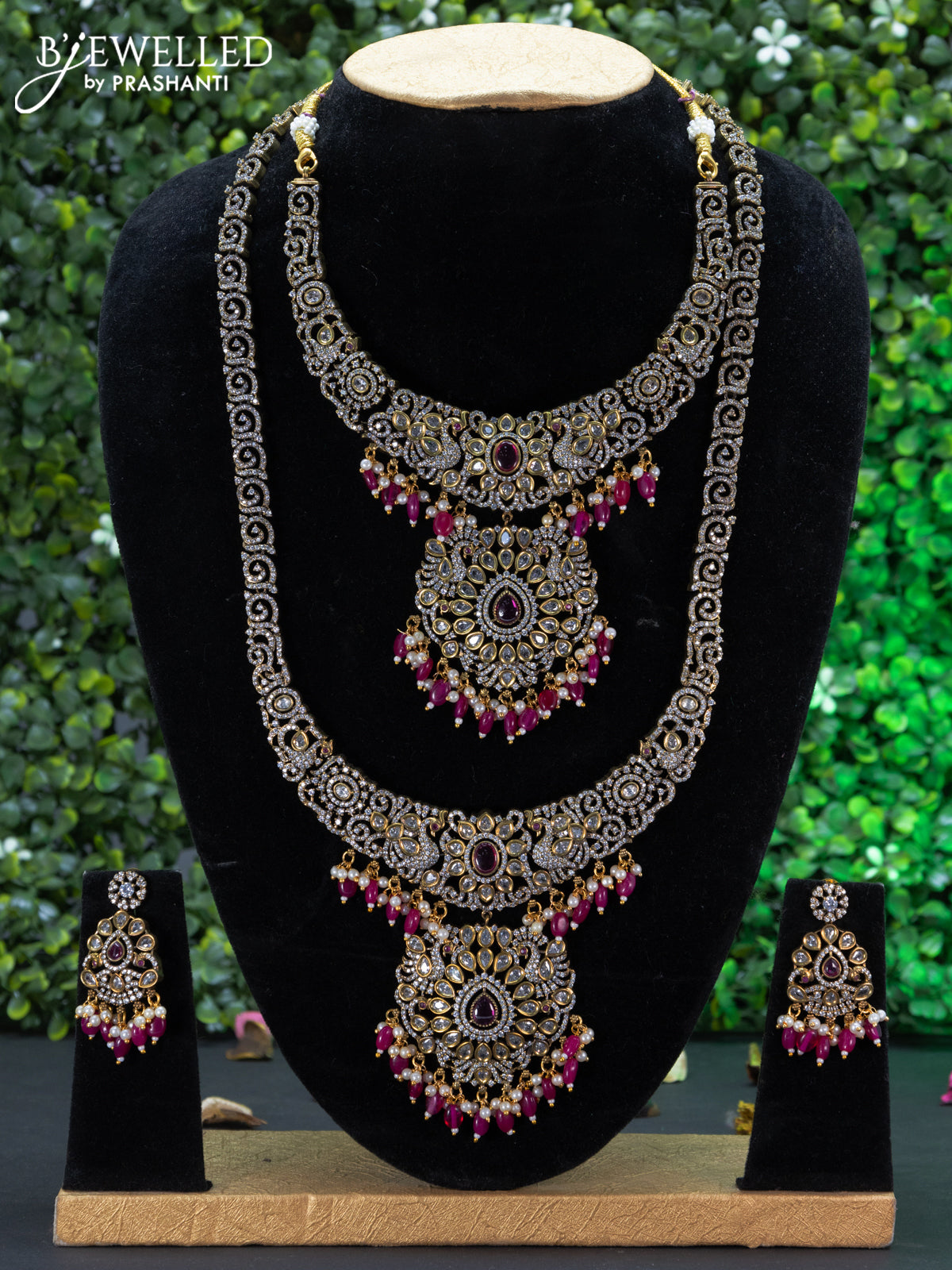 Bridal set peacock design with ruby & cz stones and beads hangings in victorian finish