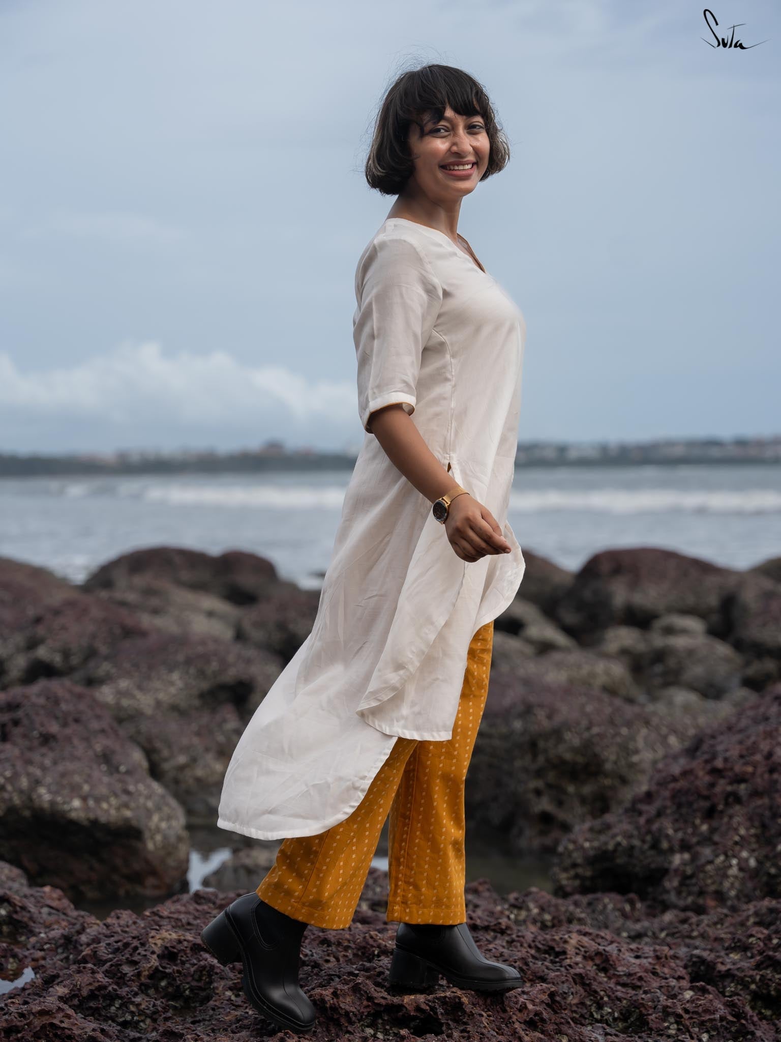 Radiate sunshine vibes with Bright Bliss, a co-ord set that brings together a crisp white top and vibrant yellow striped pants. The V-neckline and pockets add a playful twist. Perfect for casual meet-ups. Style the co-ord set with sneakers and sunnies for a breezy look.