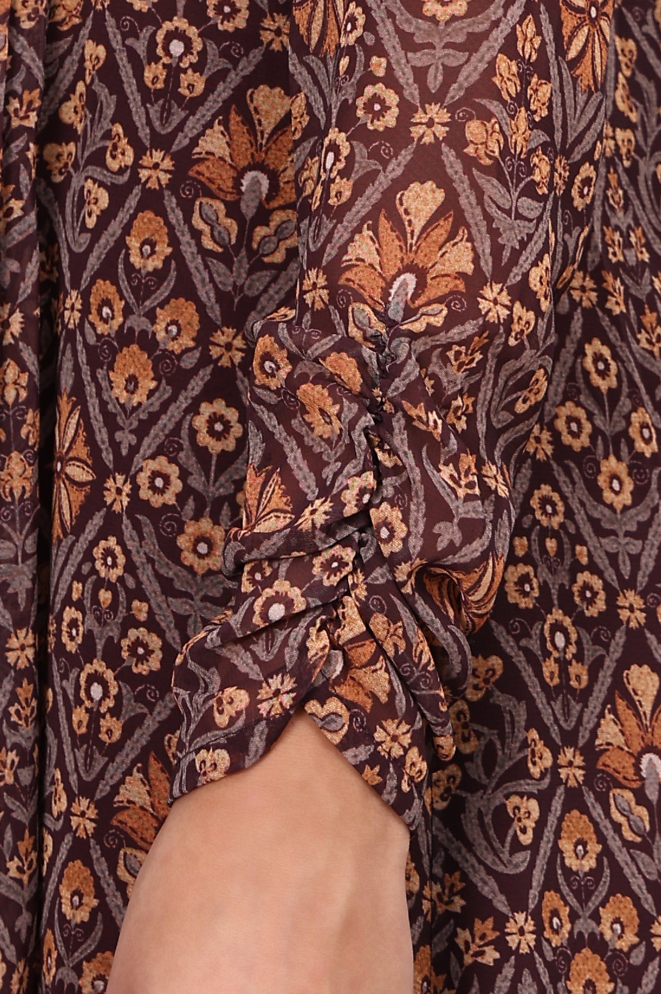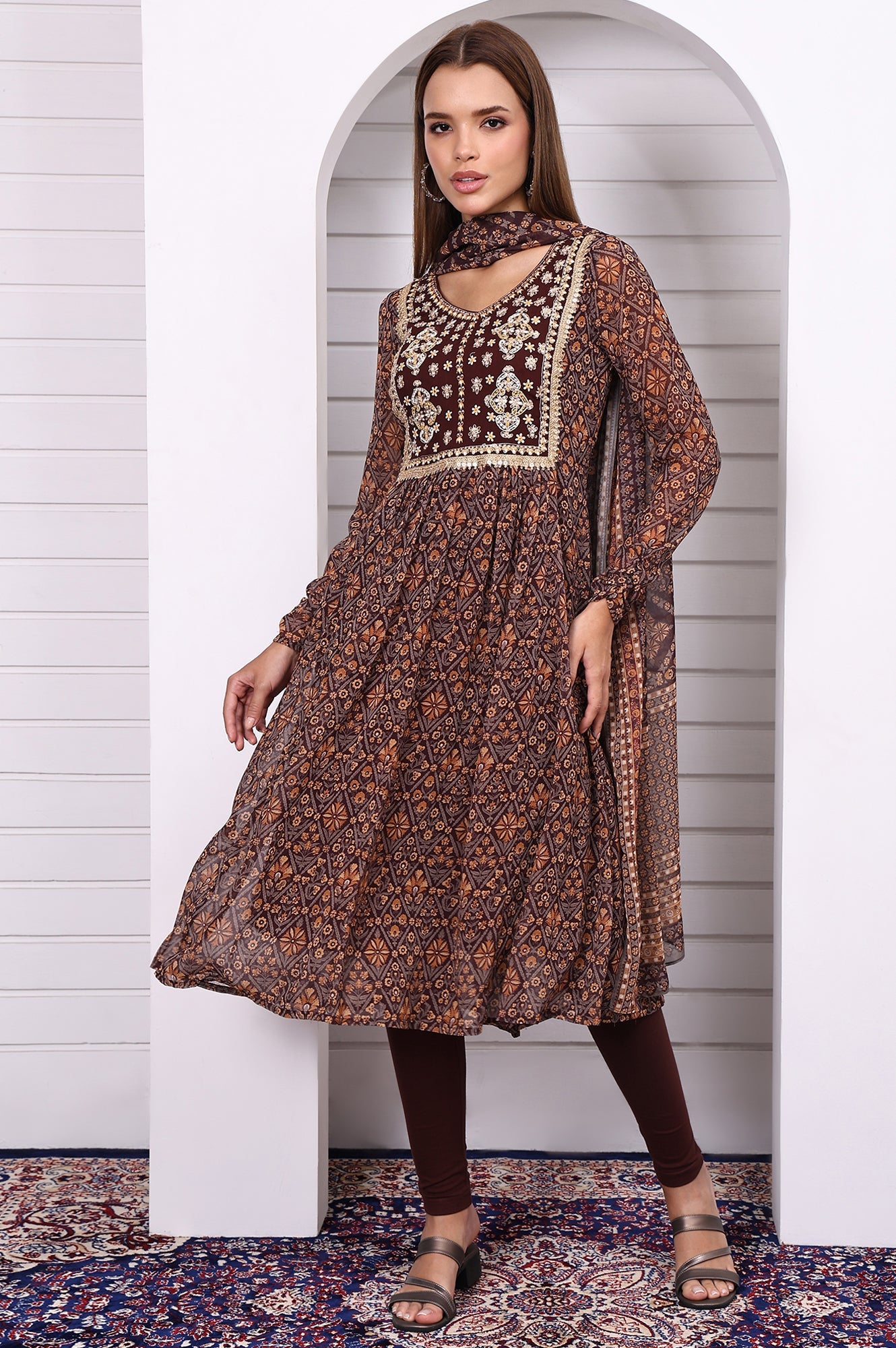 Brown Geometric Printed Zari Embroidered Georgette A-line Kurta, Leggings and Dupatta Set