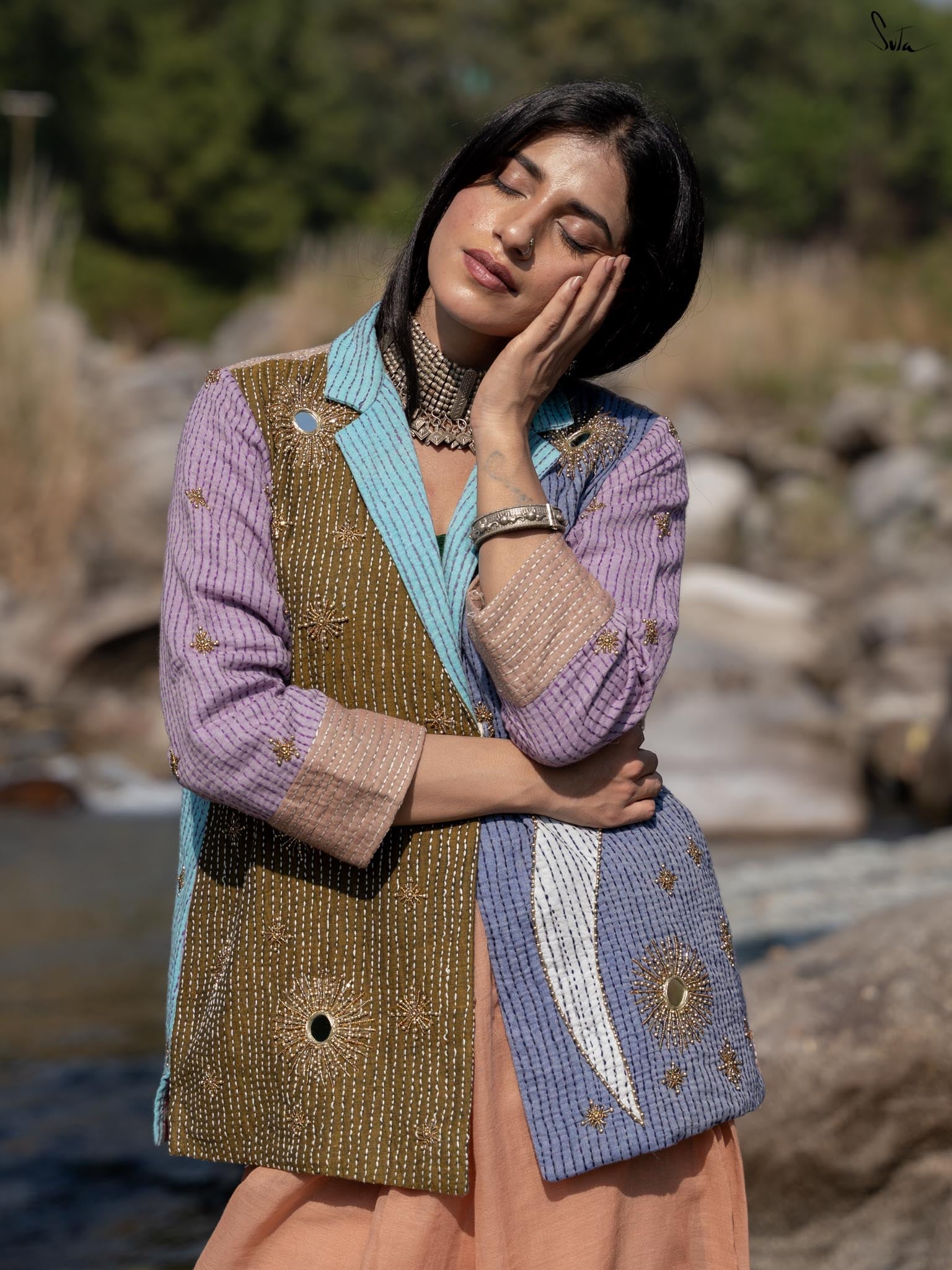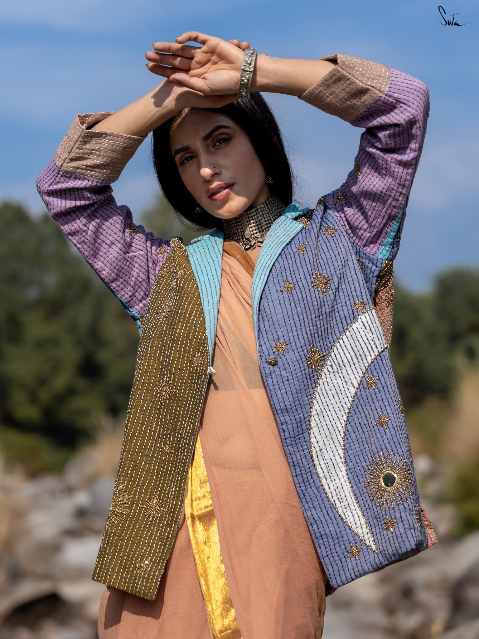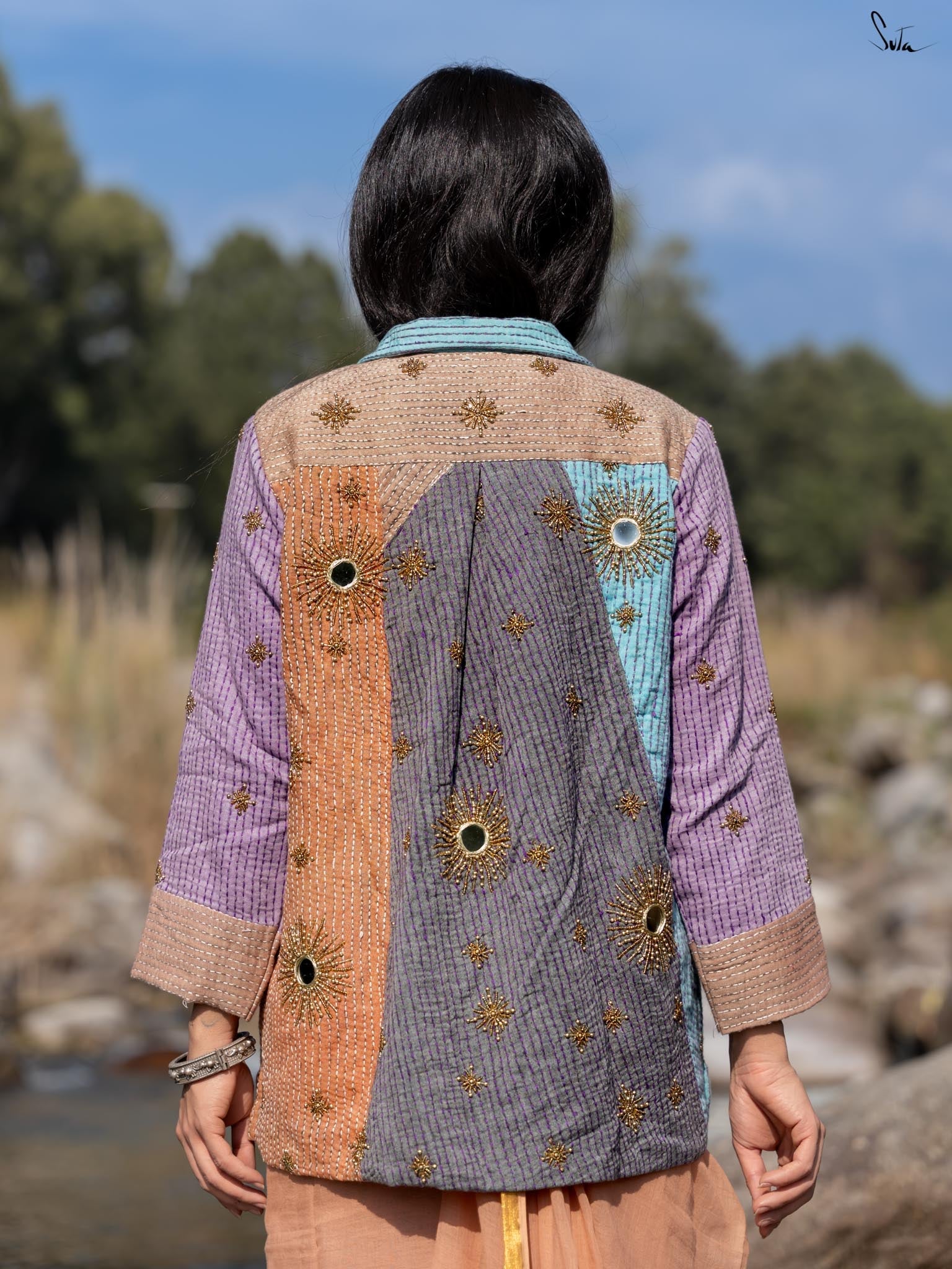 Arue celebration of craftsmanship, Chand Buta from Suta’s Bageecha collection reflects the immense time, love, and hard work that our artisans have invested. The jacket is hand-quilted in a multicolor fabric, with the Katha running stitches laying the foundation for its vibrant design. The stunning mirror work, bead embellishments, and zari embroidery are all carefully handcrafted, requiring meticulous skill and hours of patience. These elements give the jacket its glamorous and festive feel, making it a unique piece that stands out. The artisans love for their craft is evident in every stitch and bead, as they pour their heart into transforming the fabric into a work of art. The jacket is not just a piece of clothing, but a canvas of tradition and modernity, woven together with love and time. Each element is passed from one pair of hands to another, carrying the stories and dedication of the craftsmen who have worked tirelessly to create something beautiful.