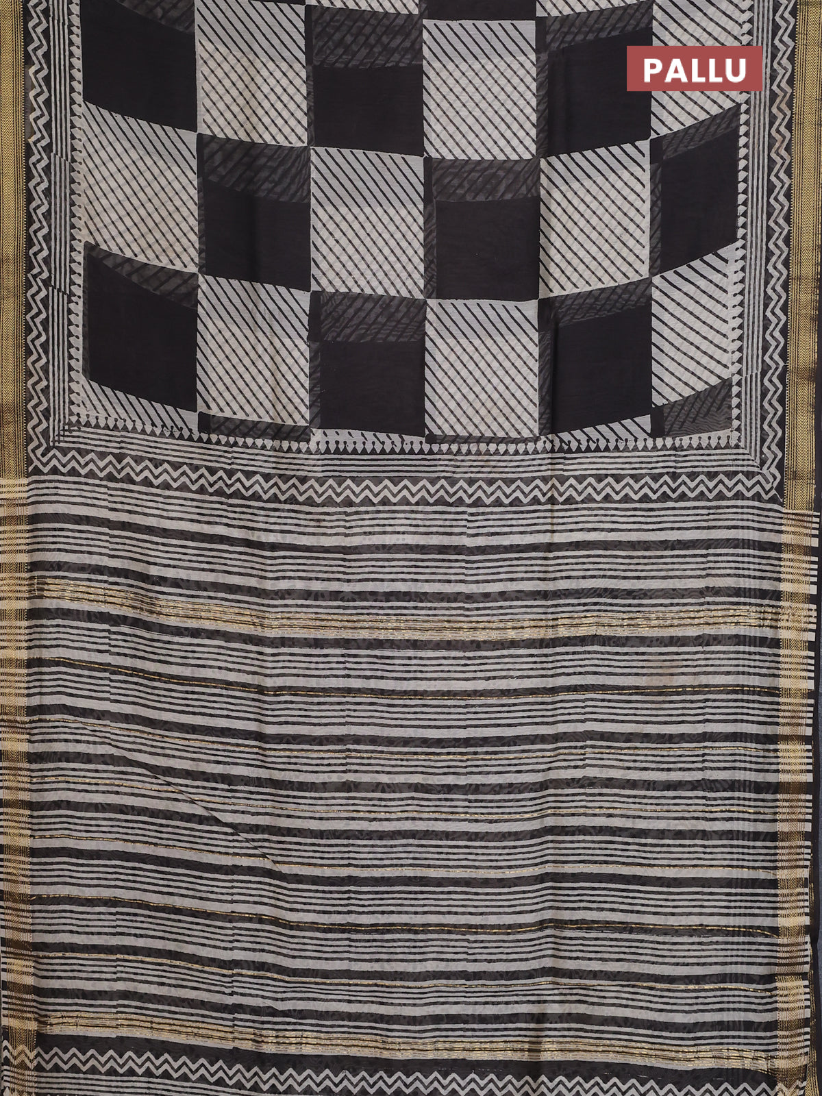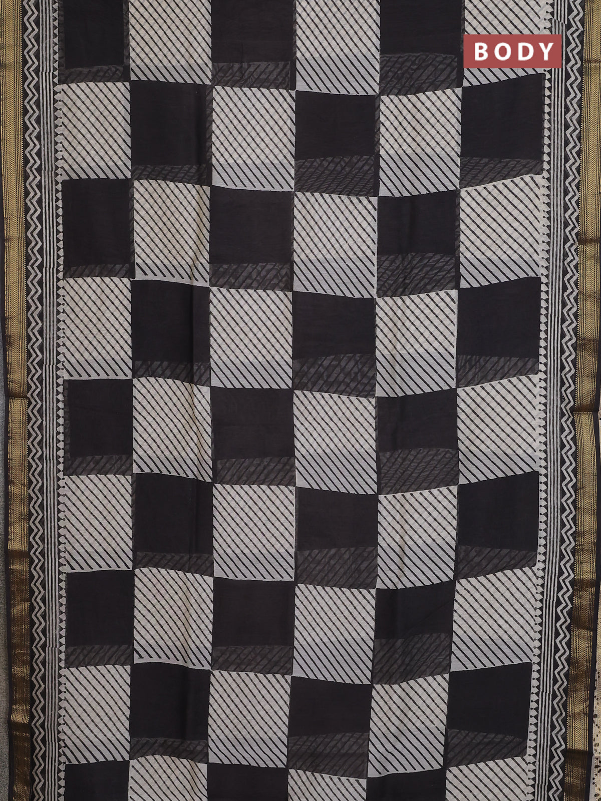 Chanderi bagru saree beige and black with allover geometric prints and maheshwari border