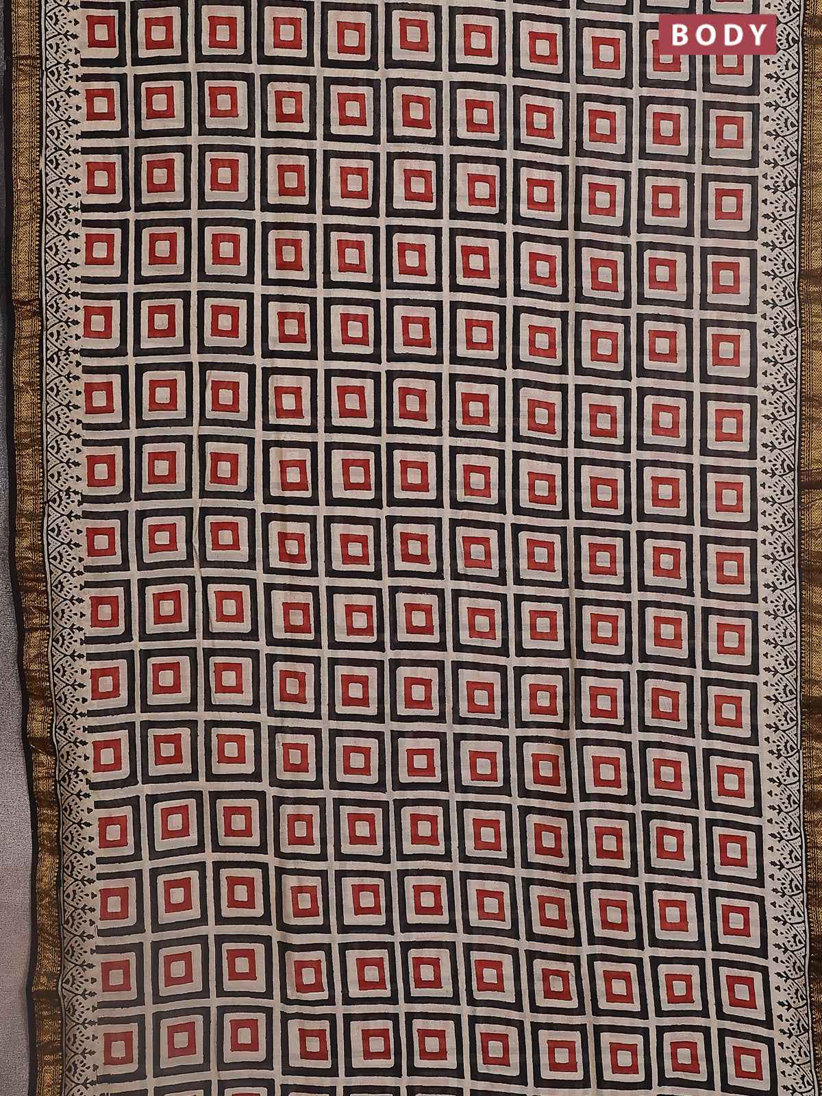Chanderi bagru saree beige and black with allover geometric prints and maheshwari border