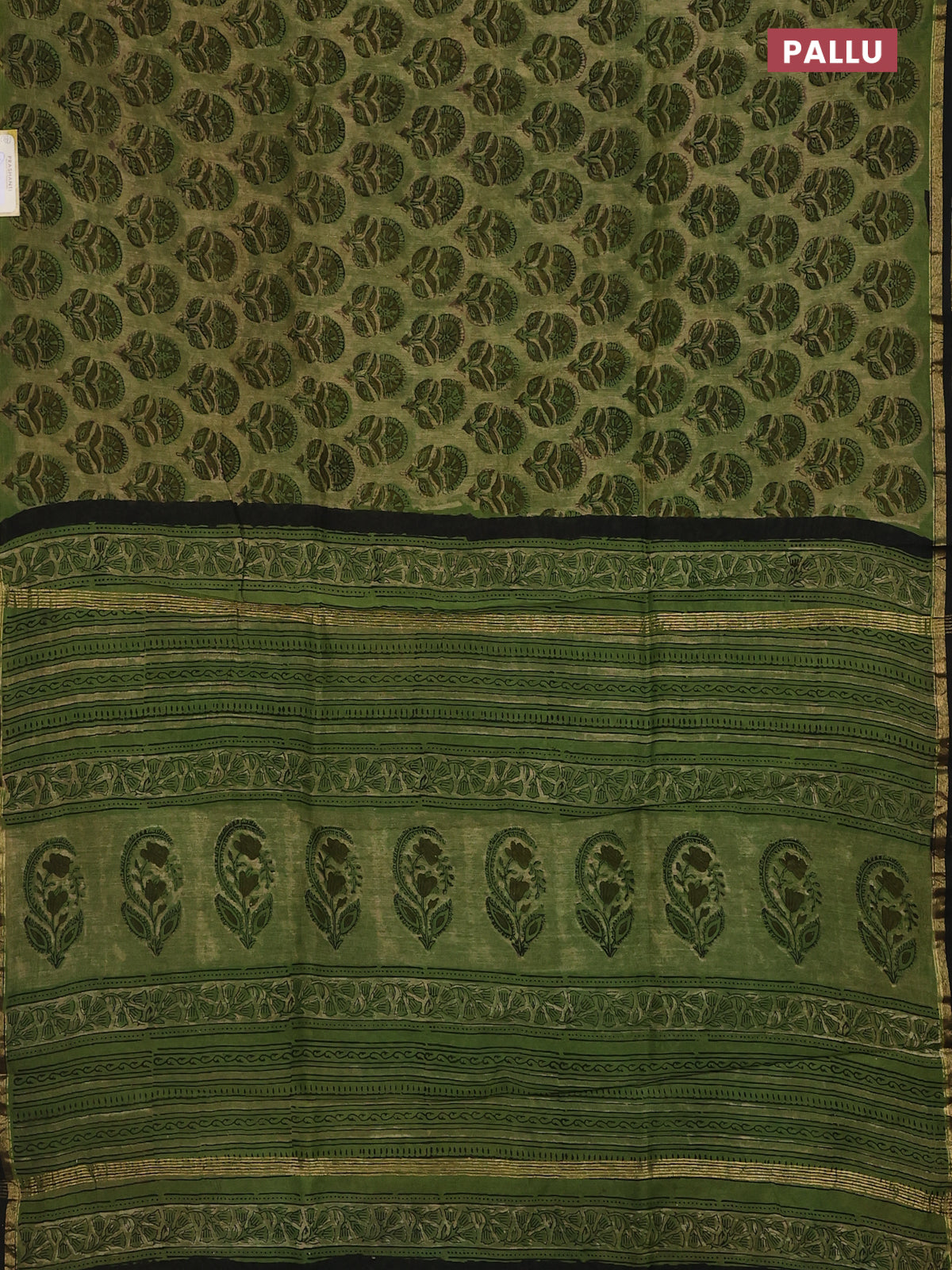 Chanderi bagru saree elaichi green and black with allover ajrakh butta prints and small zari woven border