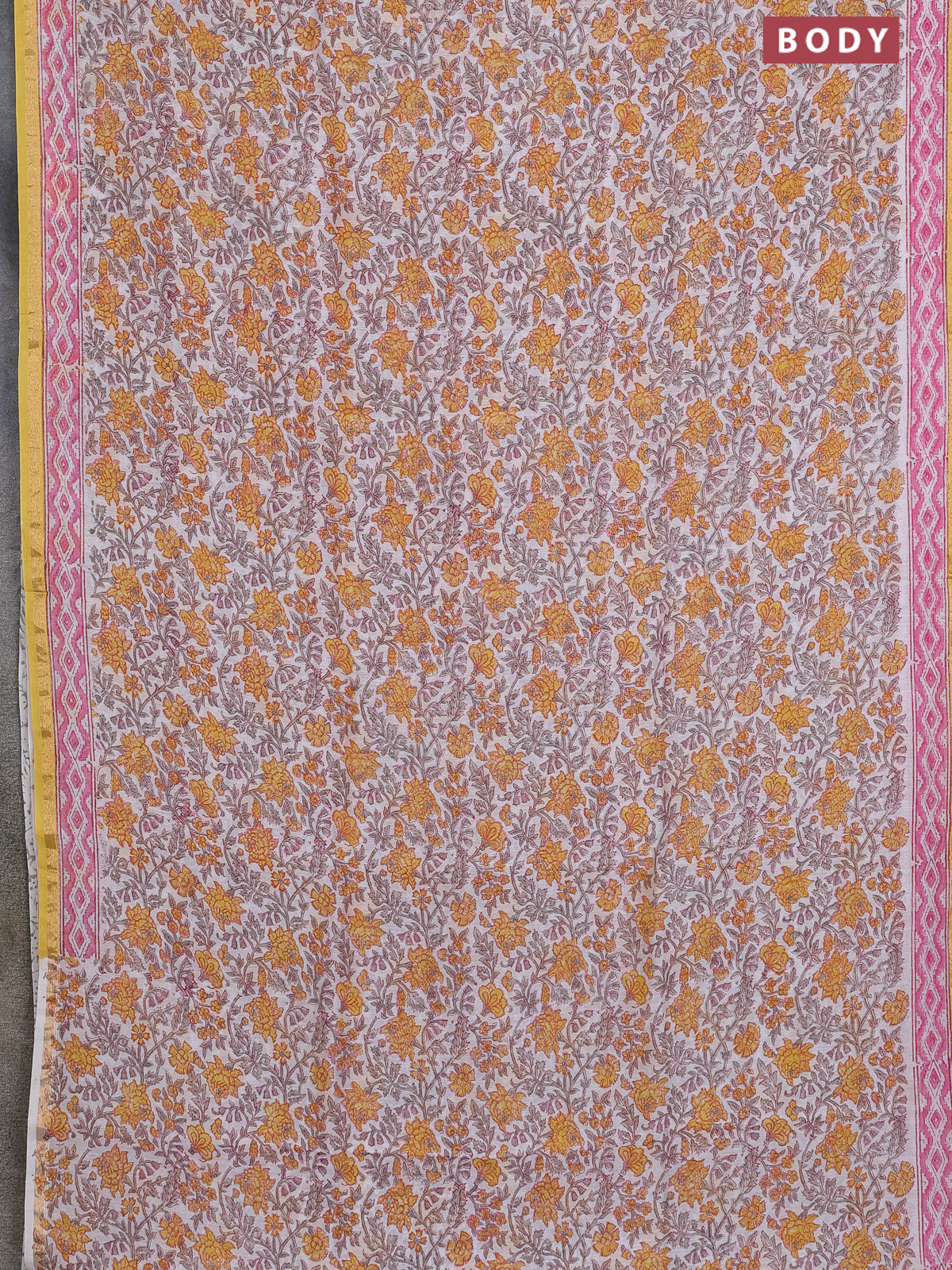 Chanderi bagru saree off white and yellow with allover floral prints and small zari woven border