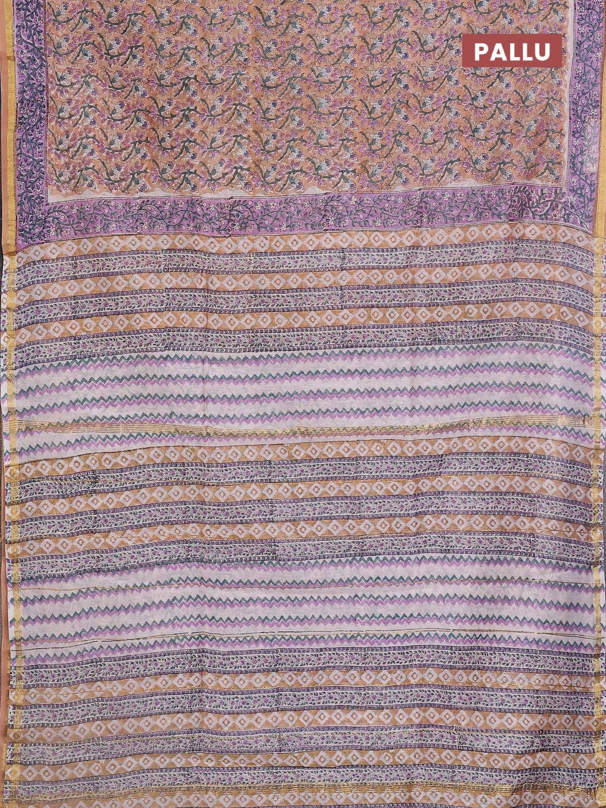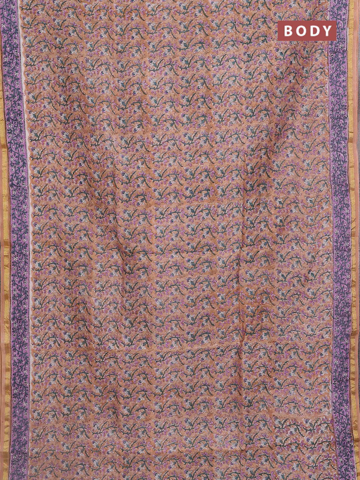 Chanderi bagru saree sandal and lavender with allover floral prints and small zari woven border