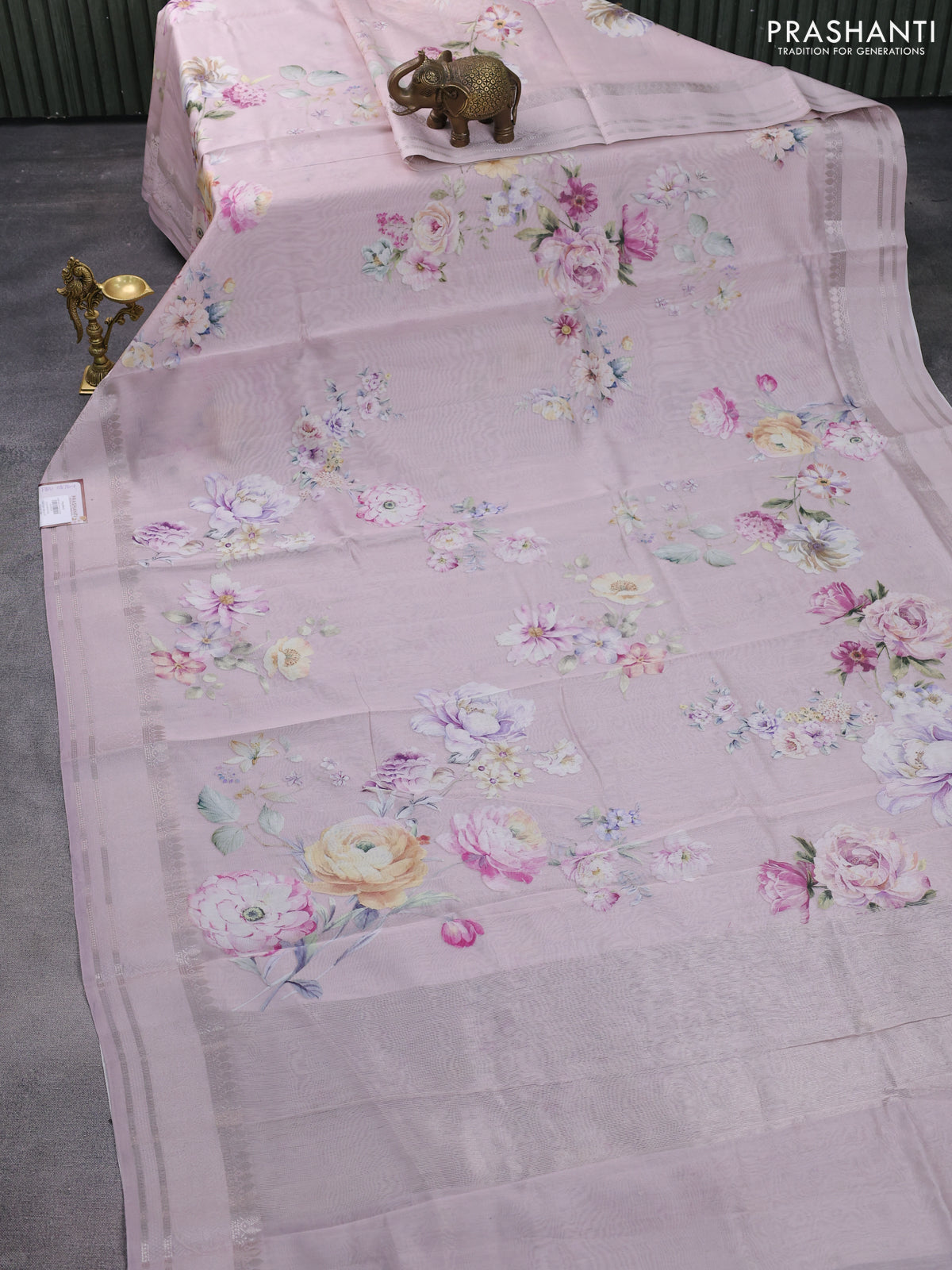 Chanderi silk cotton saree pastel pink with allover floral digital prints and thread & zari woven border