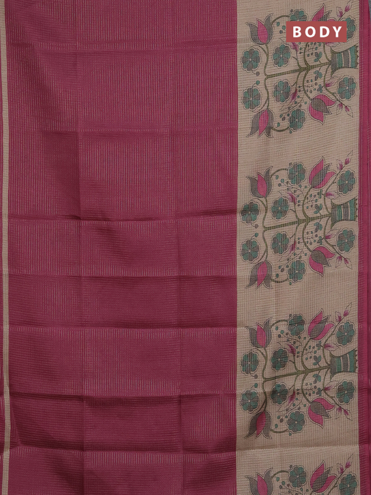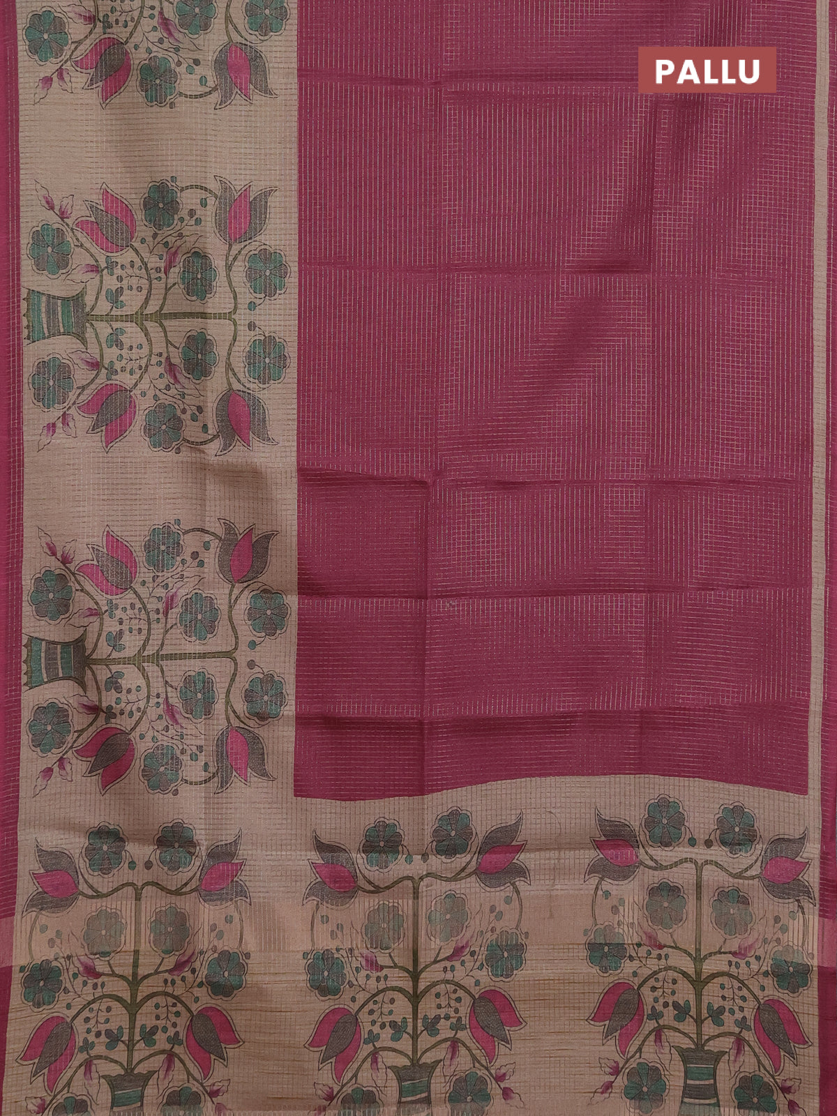 Chappa saree dark magenta pink and beige with allover small zari checked pattern and floral digital printed pallu