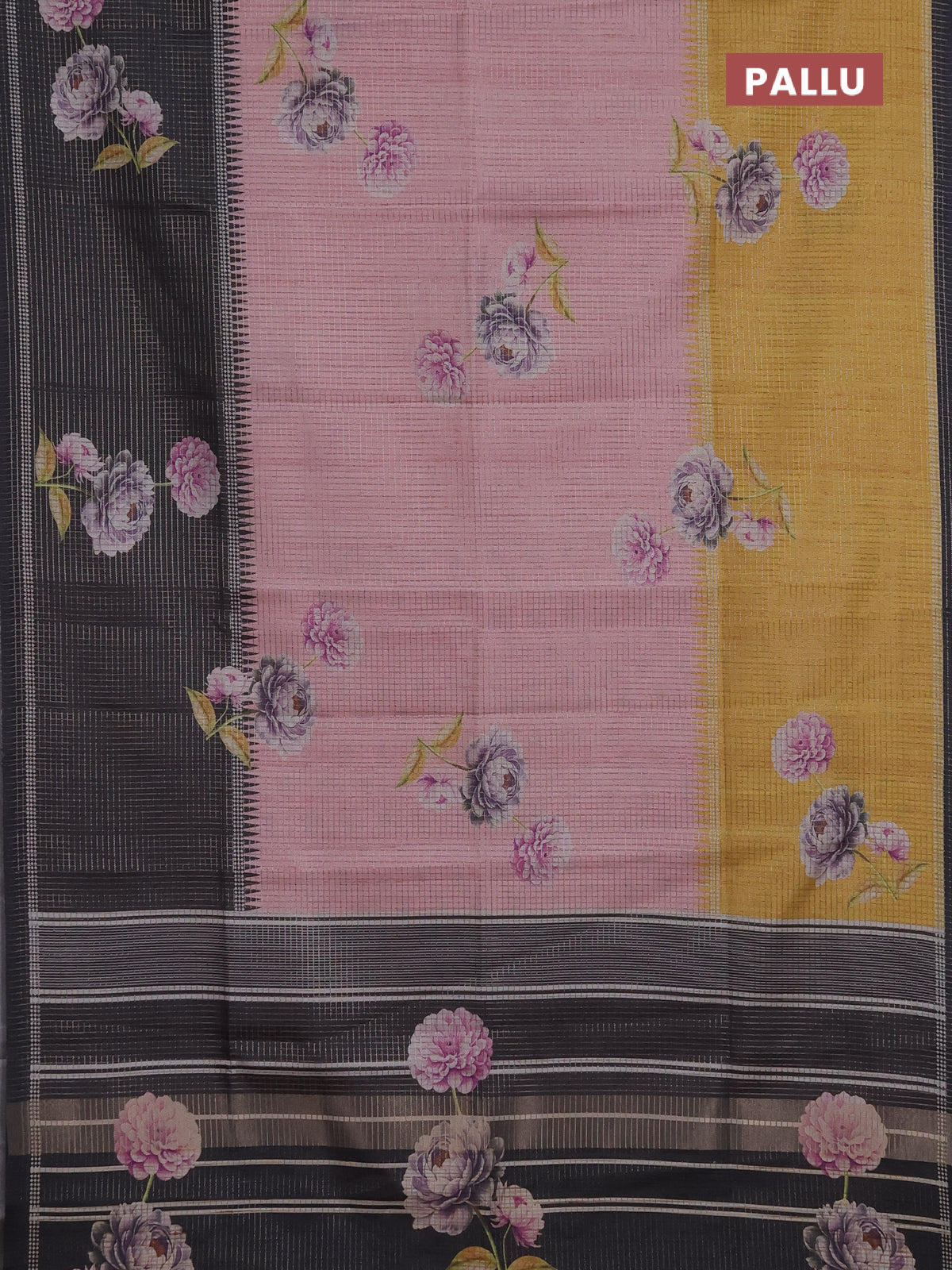Chappa saree peach pink and black with allover small zari checked pattern & floral digital prints and ganga jamuna border