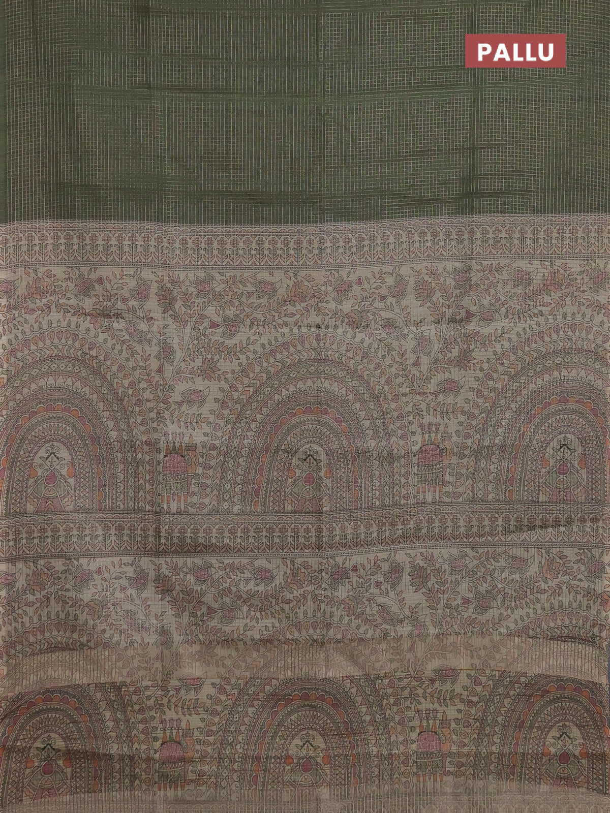 Chappa saree sap green and beige with allover small zari checked pattern and madhubani printed pallu