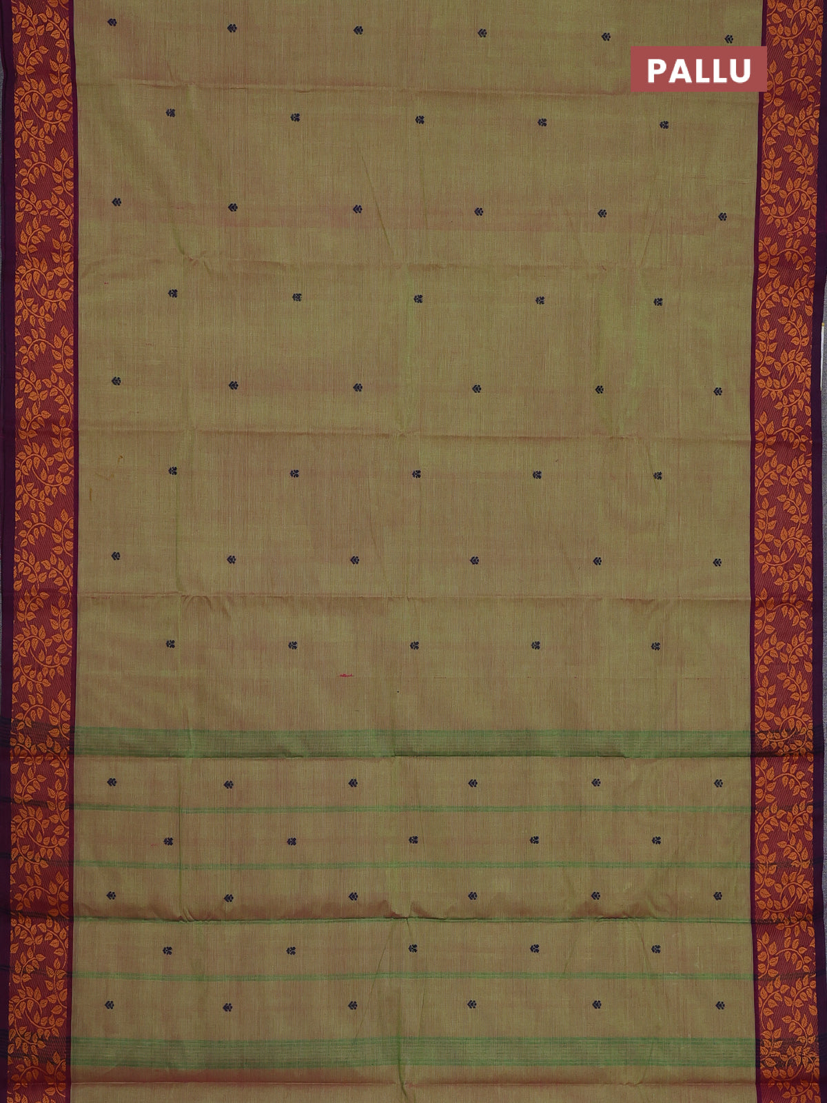 Chettinad cotton saree light green and dark magenta pink with thread woven buttas and leaf design border