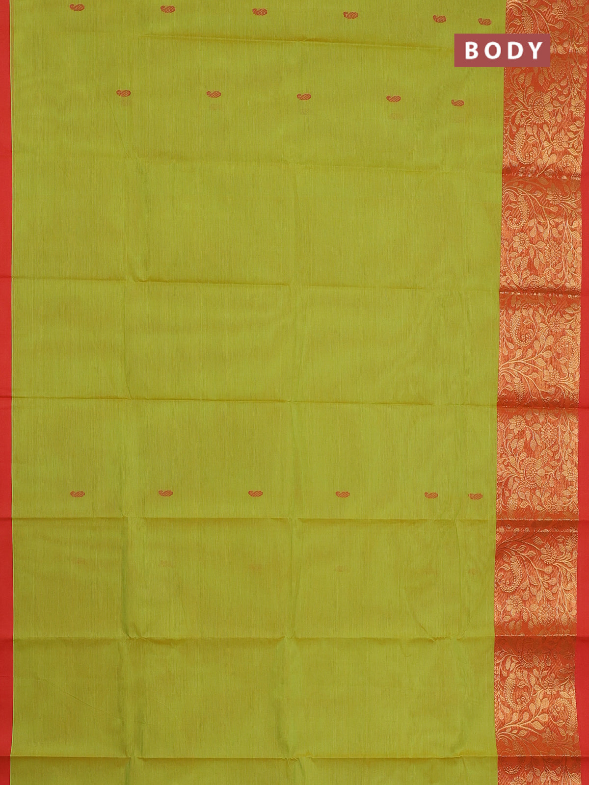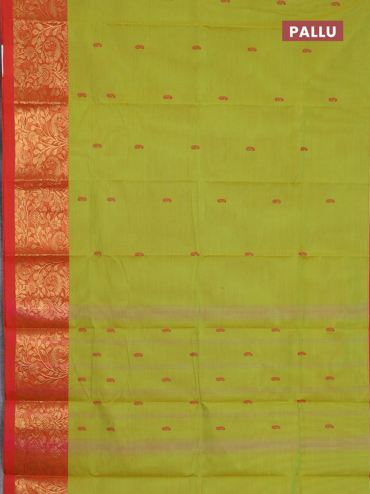 Chettinad cotton saree lime green and red with thread woven buttas and zari woven border
