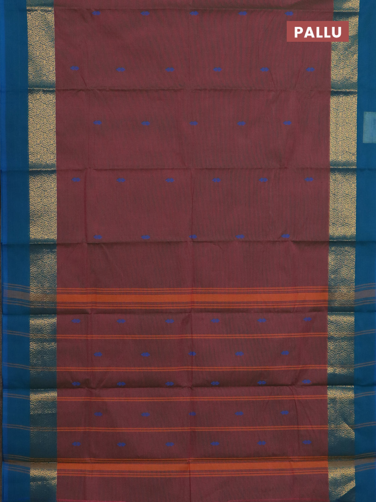 Chettinad cotton saree mauve pink shade and blue with thread woven buttas and zari woven simple border
