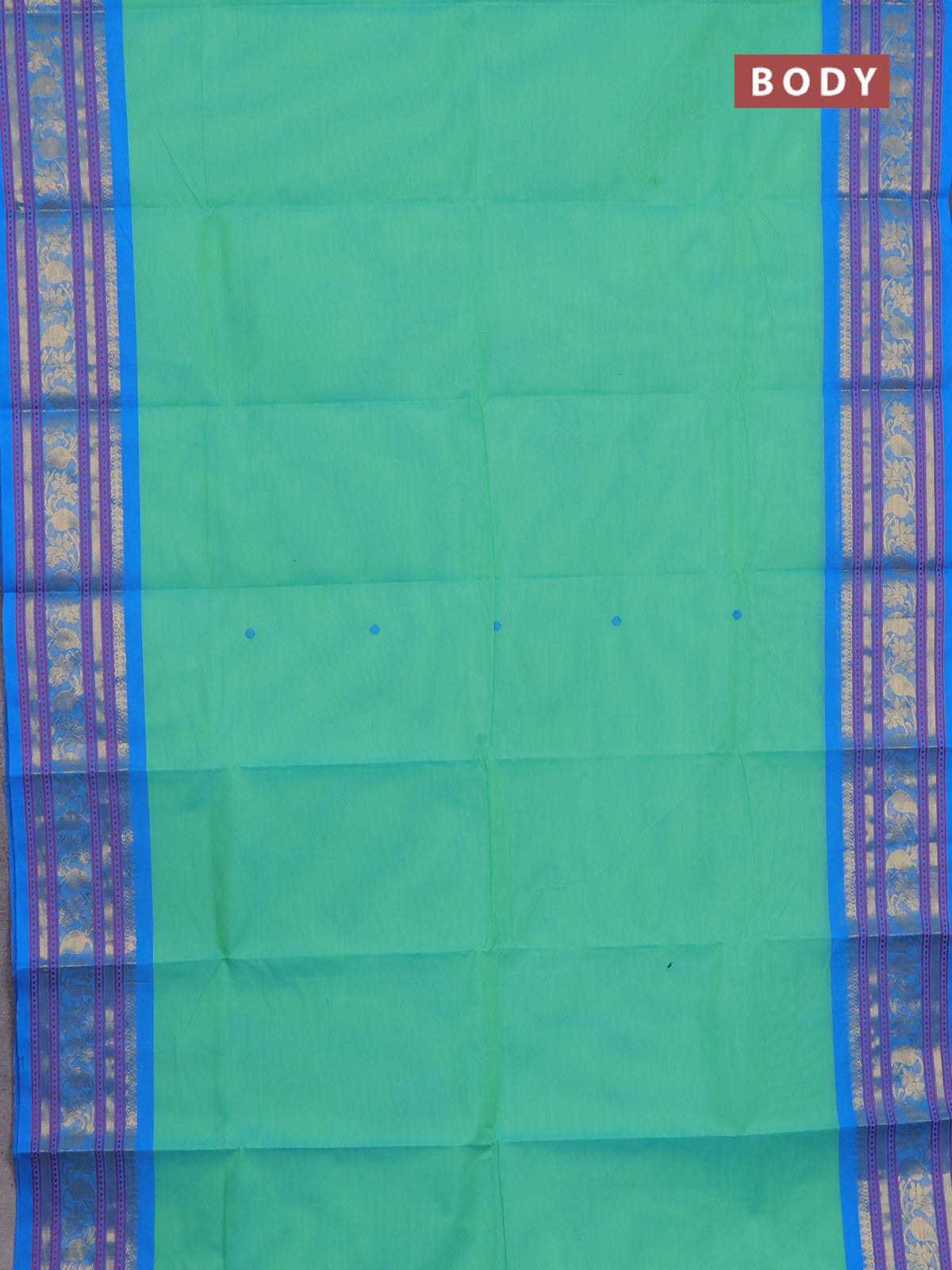 Chettinad cotton saree teal green and blue with thread woven buttas and temple disign zari woven border
