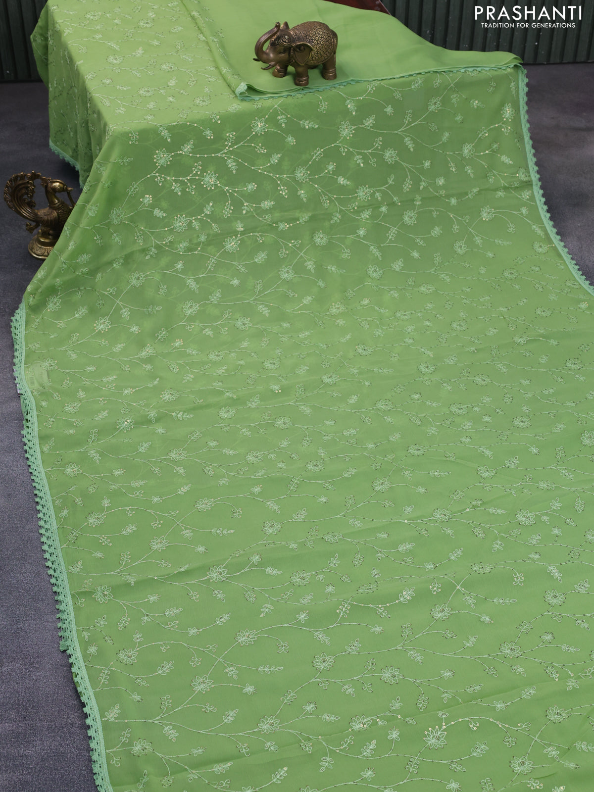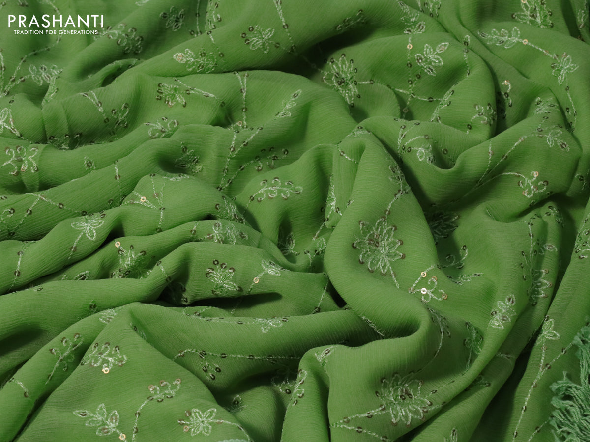 Chiffon saree green with allover chikankari & sequin work and lace work border