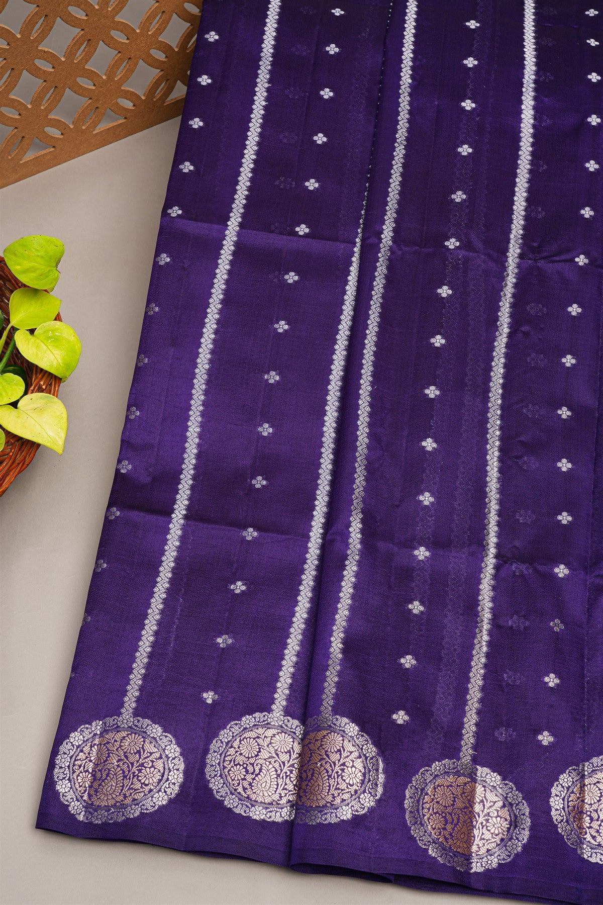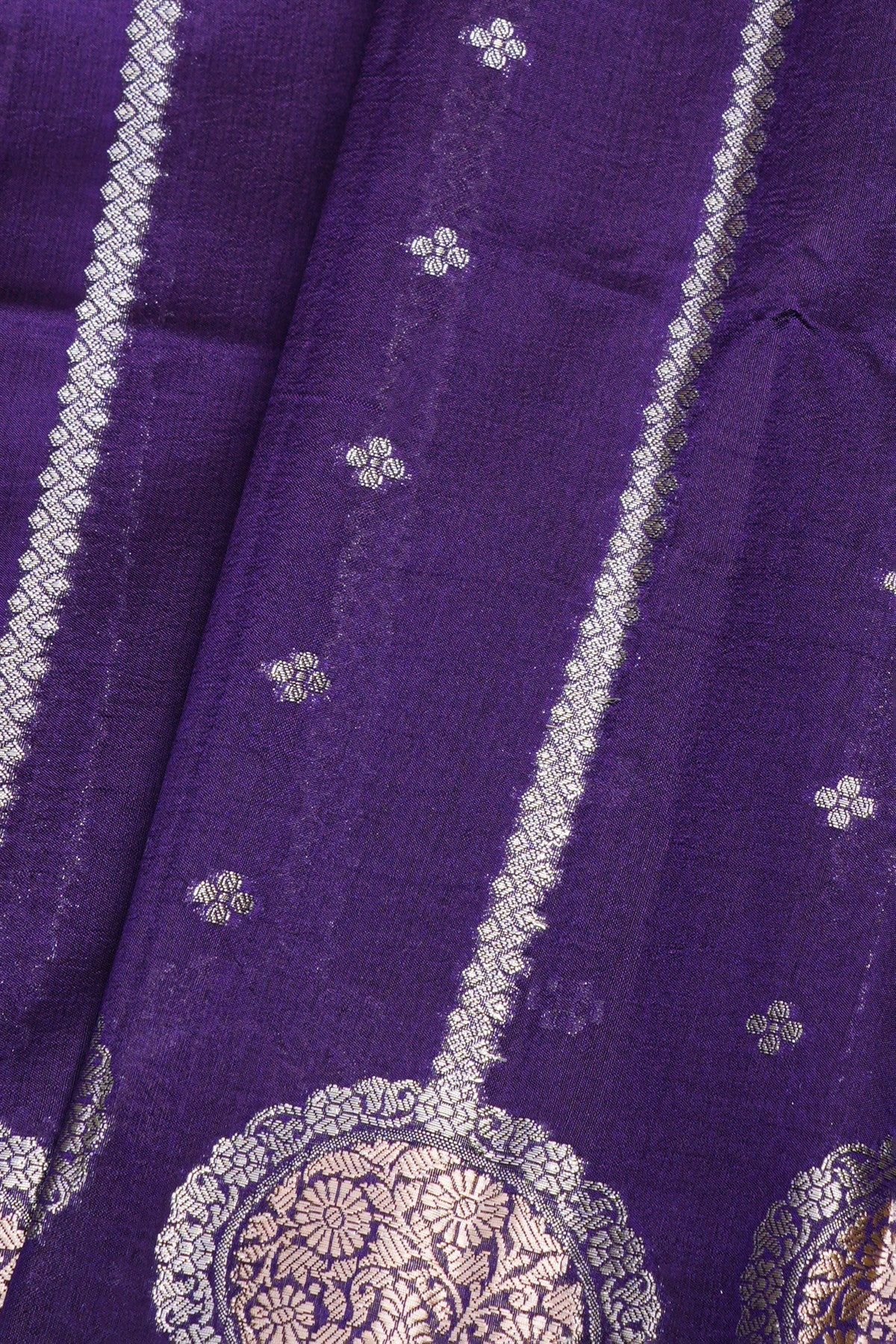 Embrace your spiritual self in this Chiniya Silk Navy Blue Saree. This goddess inspired saree is tastefully adorned with florals in lines. The contrast border decorated with florals and paisleys in circles resonates the essence of culture. The grand brocade pallu and the regal contrast with border blouse puts together an eclectic ensemble.