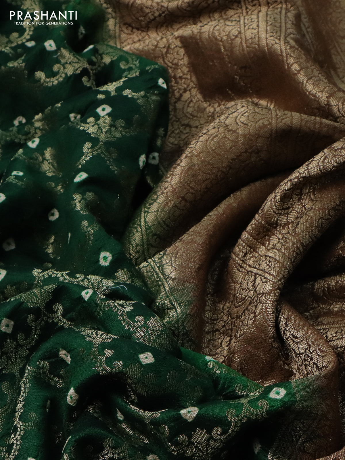 Chiniya silk saree green and brown with allover zari weaves & bandhini prints and zari woven border