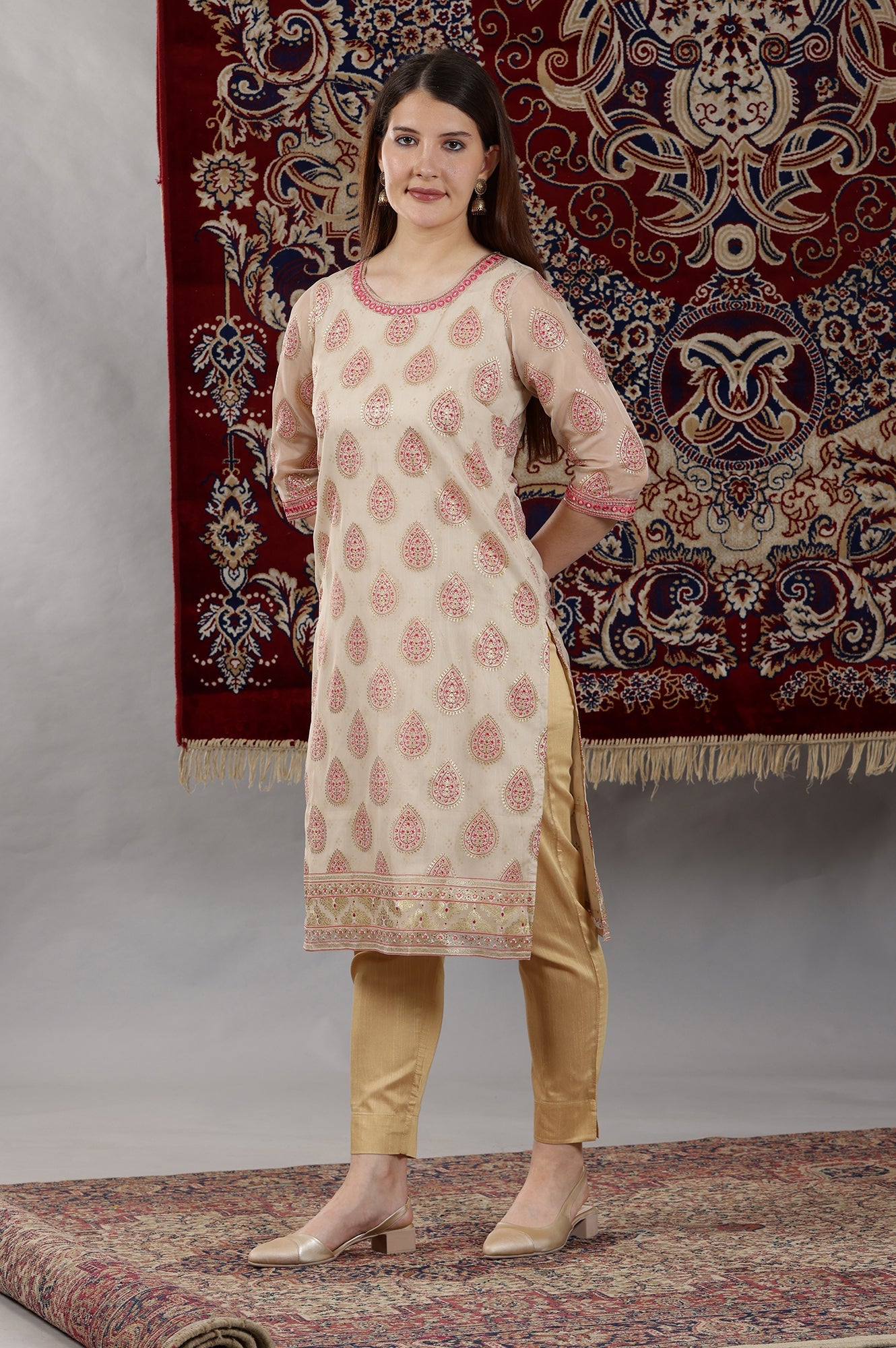 This sheer organza straight kurta is an absolute must-have for your wardrobe. Featuring exquisite mirror embroidery in a striking contrast pop-up color, it stands out beautifully against a light-colored base, creating a chic and sophisticated look. Ideal for any festive occasion, this kurta promises to turn heads and make a memorable impression. Its elegant design and refined detailing ensure you’ll be the center of attention, radiating confidence and style. Adorn yourself with this standout piece and embrace a look that is both timeless and contemporary.