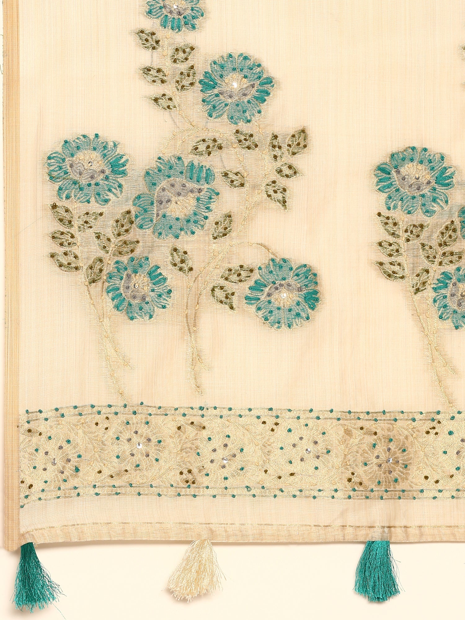 Cream Chanderi Silk Saree With Sequins And French Knot Embroidery