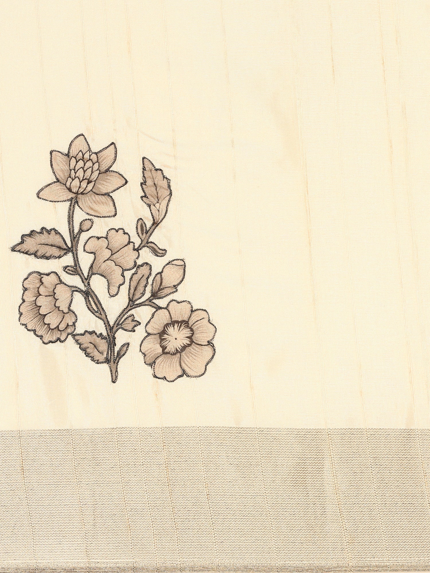Elevate your elegance with this cream natural dupion saree, adorned with delicate floral prints. The rich texture of dupion silk combined with subtle floral motifs creates a timeless piece perfect for sophisticated occasions. Its soft cream hue complements a variety of accessories, making it versatile for both day and evening wear. Experience classic beauty and refined style with this graceful saree.