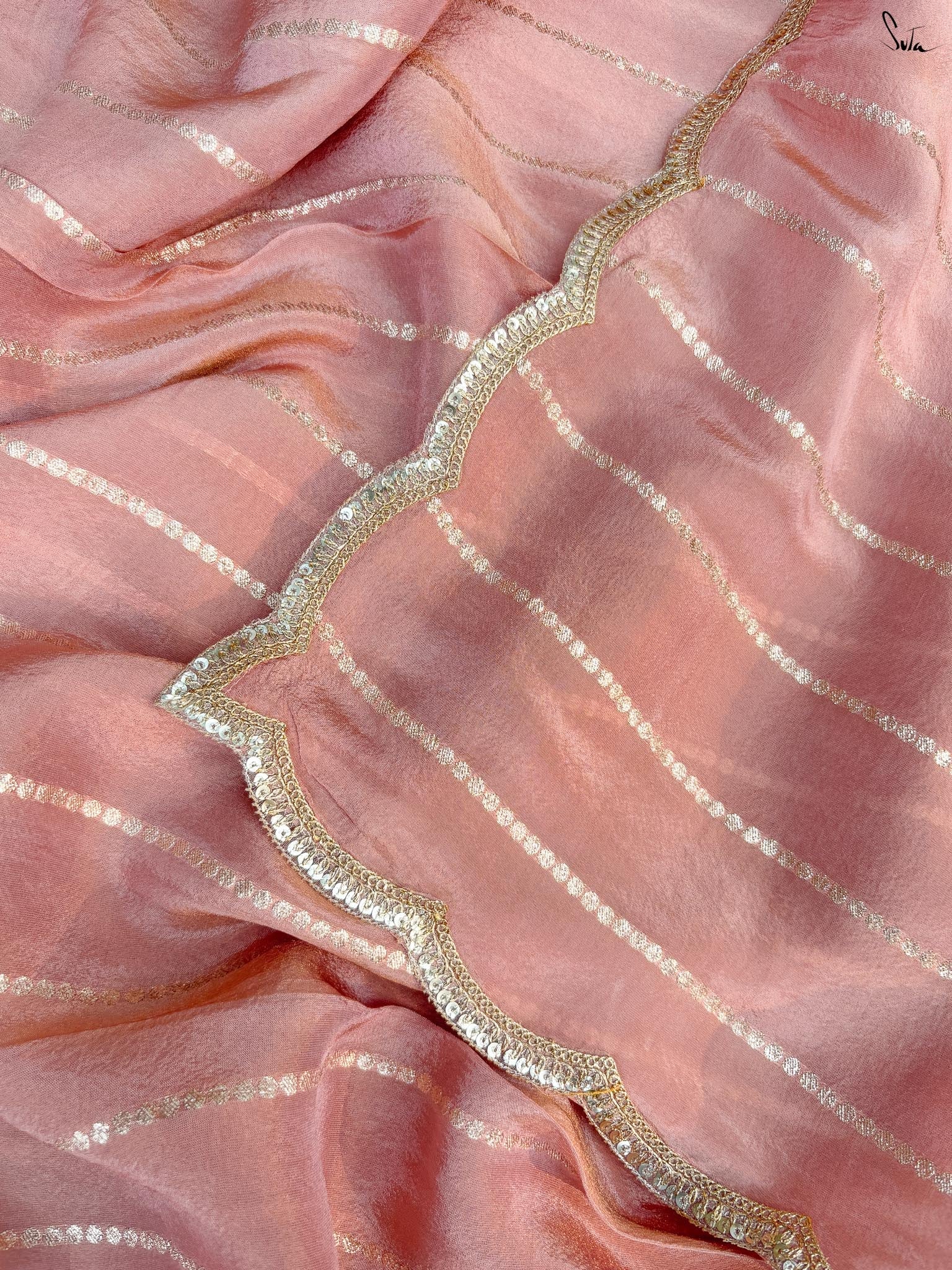 A saree that feels like sunrise caught in silk. The peach hue radiates warmth, wrapping you in a soft, flattering glow. Viscose zari lends it a molten gleam that moves with you. The zari stripes glint like light skimming over water. Embroidered scallop lace frames it with an air of effortless allure.