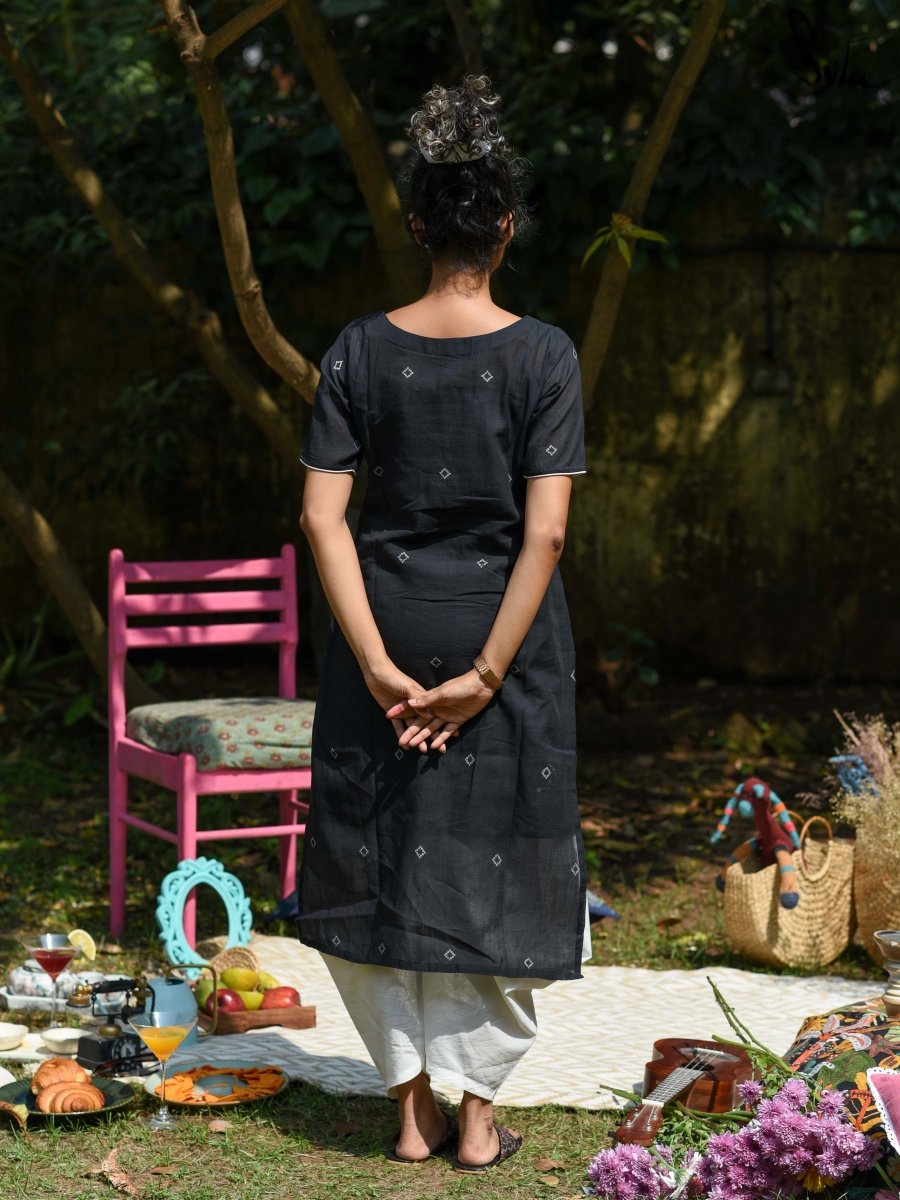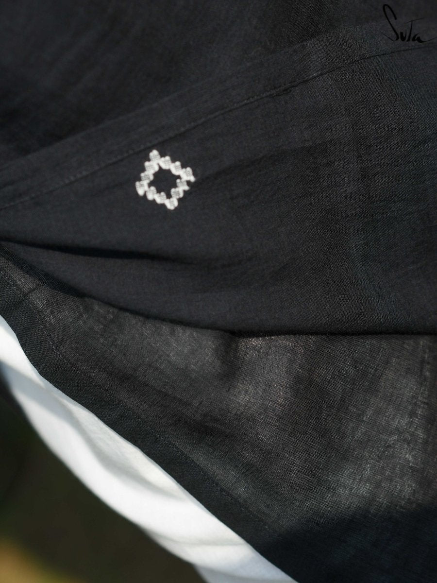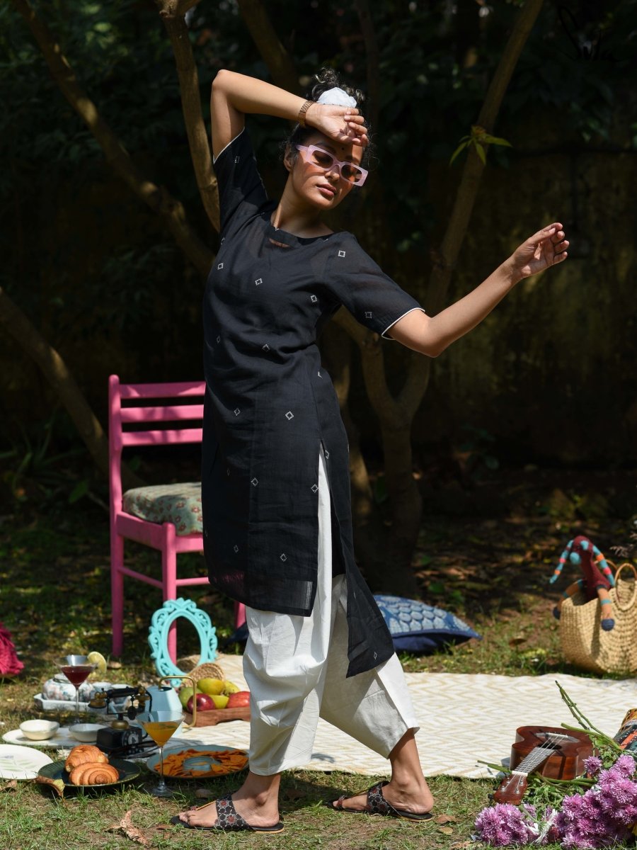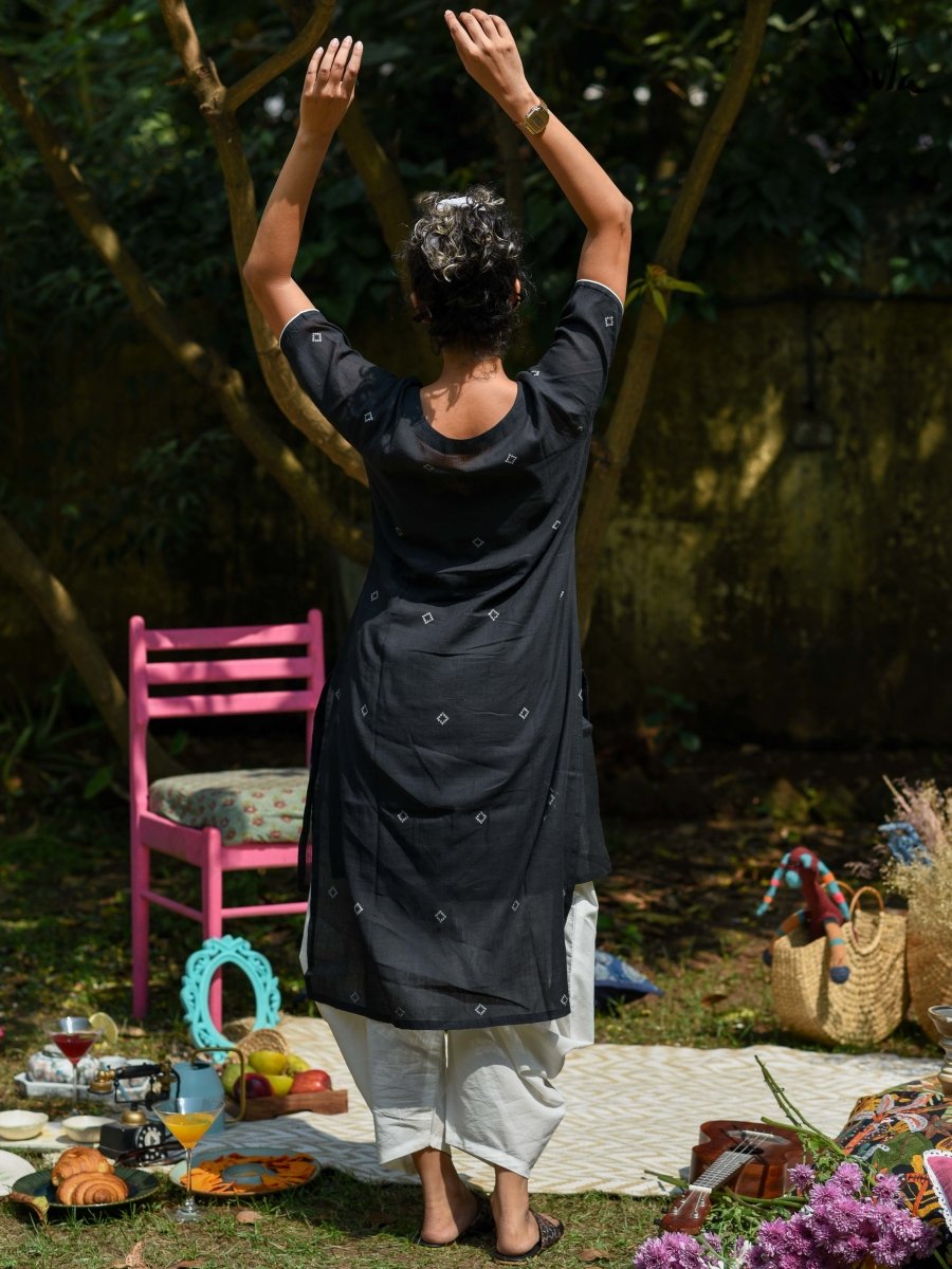 Relive the magic of a moonlit night when you wear this breezy black kurta, which is paired with white bottoms. The kurta is made of handloom Jamdani cotton, while the bottoms are made of cotton. This set includes an under-layer.