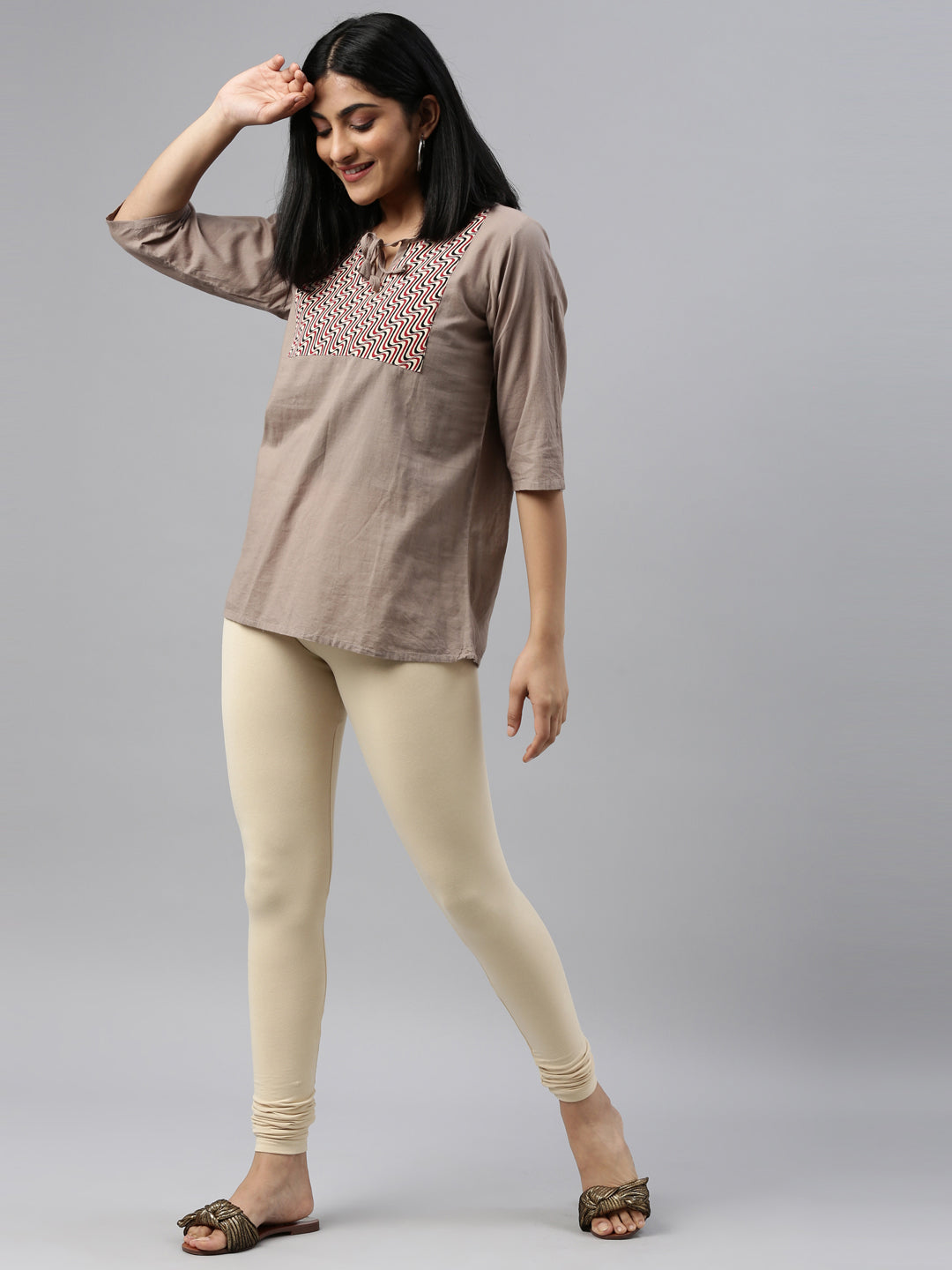 Go chic with a pair of Dark Cream Solid Churidar Leggings. Made from high quality cotton, it has a elasticised waistband & gathers at the hemline.