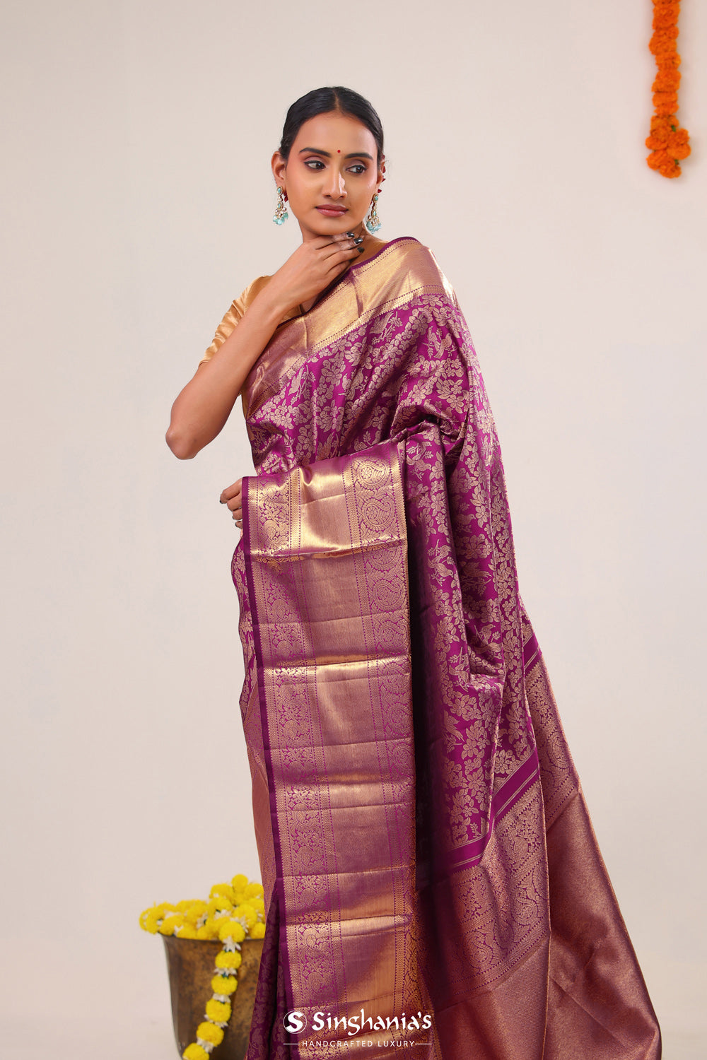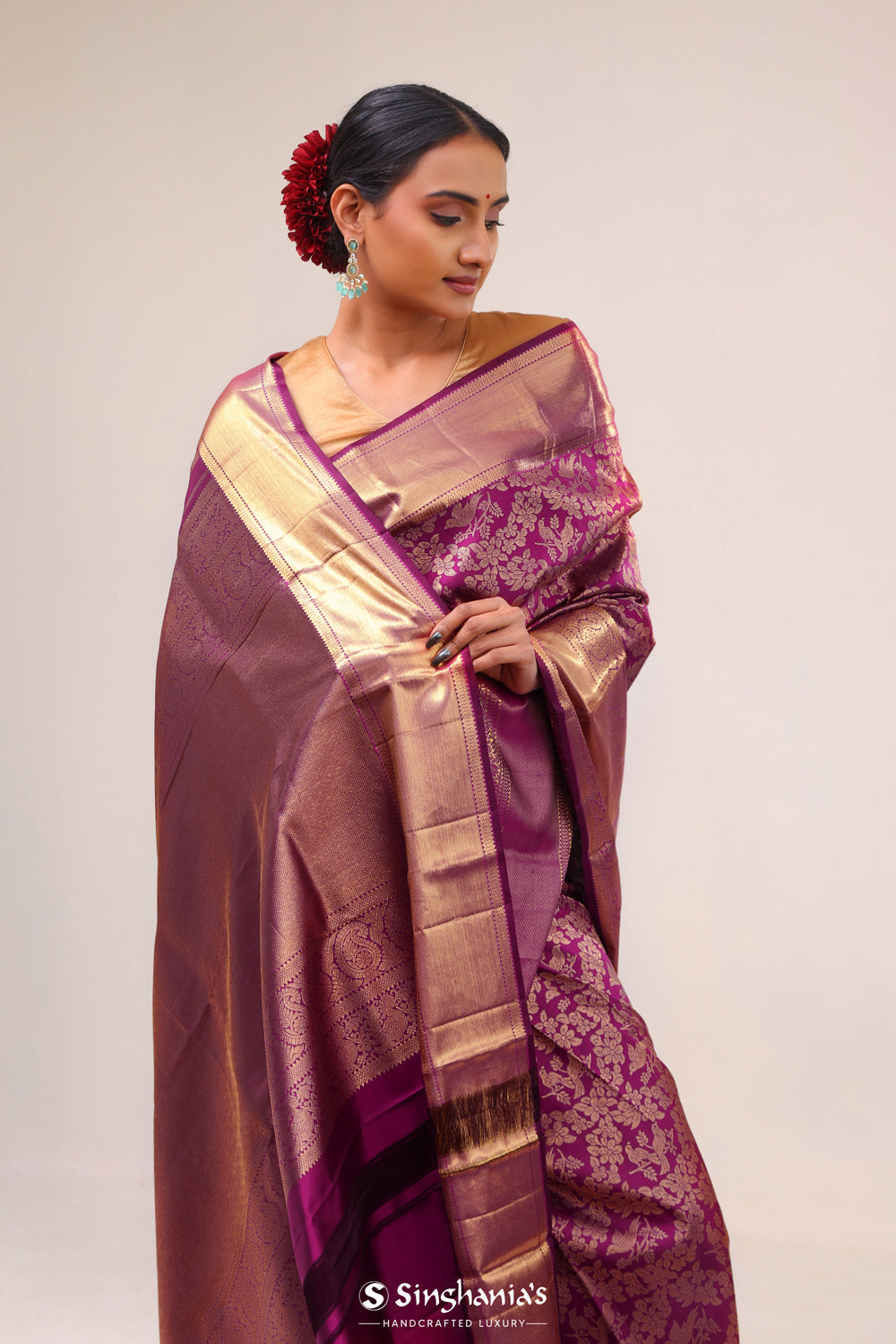A dark raspberry kanjivaram silk saree featuring the traditional floral jaal and birds woven in gold zari. The broad border displays classical floral-peacock patterns, while the pallu boasts an elaborate arrangement of floral vines. Ideal for traditional ceremonies and festive gatherings.