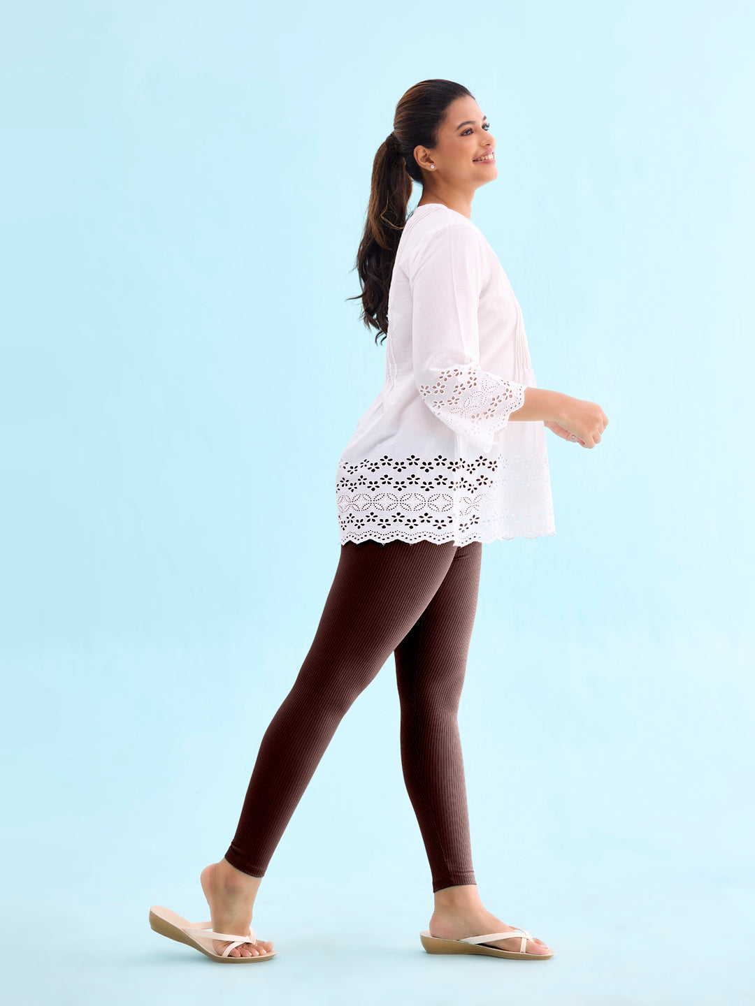 Go the ethnic way with our Solid Dark Wine Ribbed Leggings. Made from Rayon Spandex it has a elasticised waistband, slim fit is of ankle length