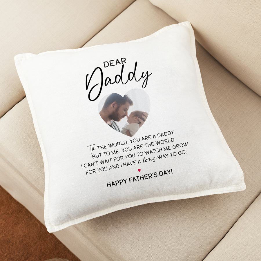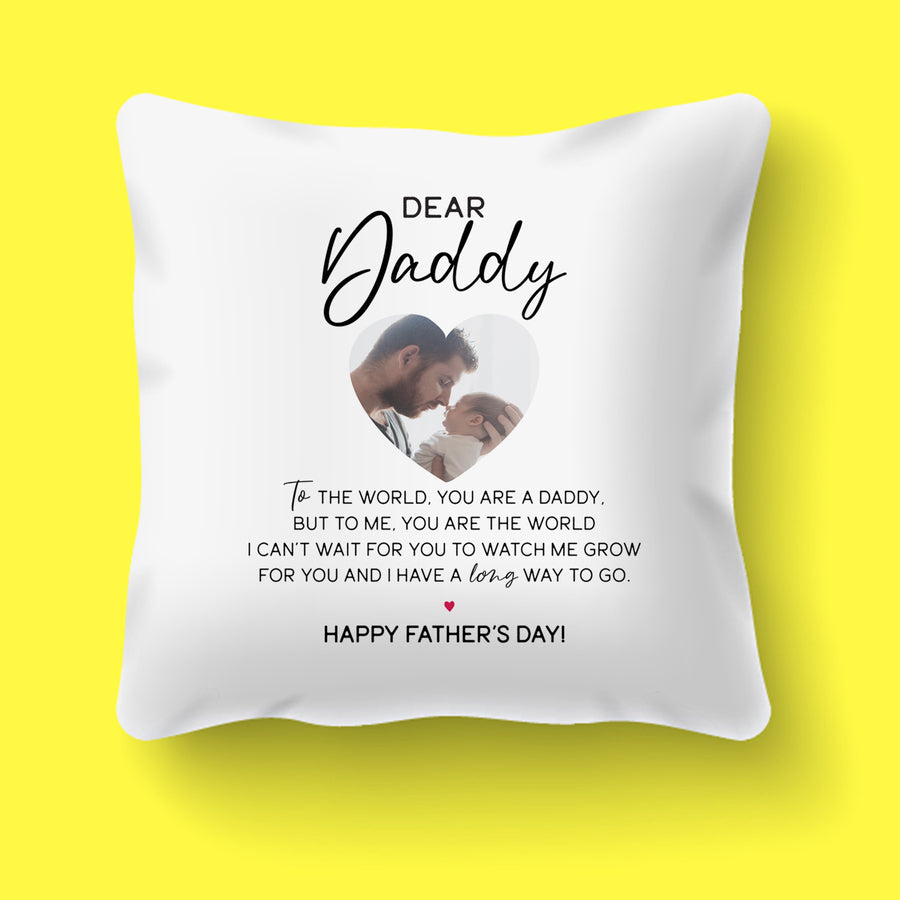 The cushion holds a sweet message from the baby and is customizable with a cute photo of the baby and it's daddy.