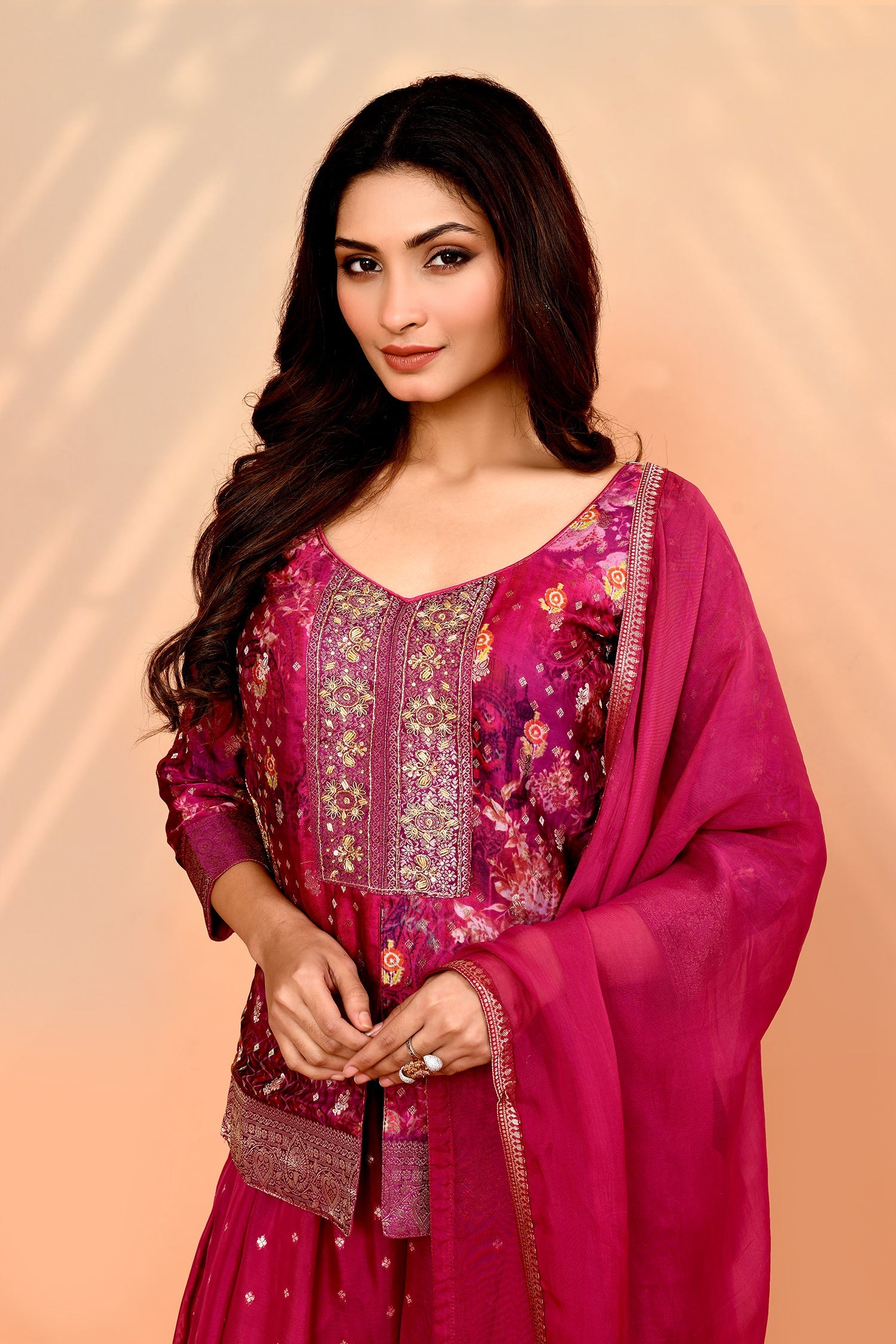 The deep pink georgette floral sharara set with dupatta and floral printed V-neck top for a neat traditional look with graceful appearance.