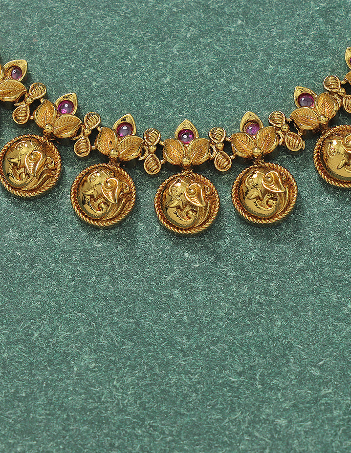 This Matt Polish Kempu Necklace Set, studded with dazzling ruby stones, radiates elegance and style. Its unique design is a visual treat, making it the perfect statement piece for any occasion.