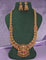 This Matt Gold Plated Kempu Long Haram Set, adorned with AD stones, is a celebration of timeless tradition. Paired with matching earrings, it’s the perfect pick to elevate your ethnic style with regal elegance.