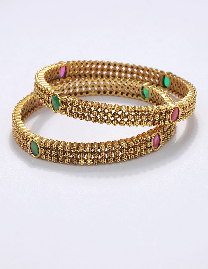 Intricately designed with a lattice of golden floral patterns and adorned with deep ruby and emerald-toned stones, these bangles exude vintage charm and royal elegance. A perfect accessory for weddings and traditional festivities.